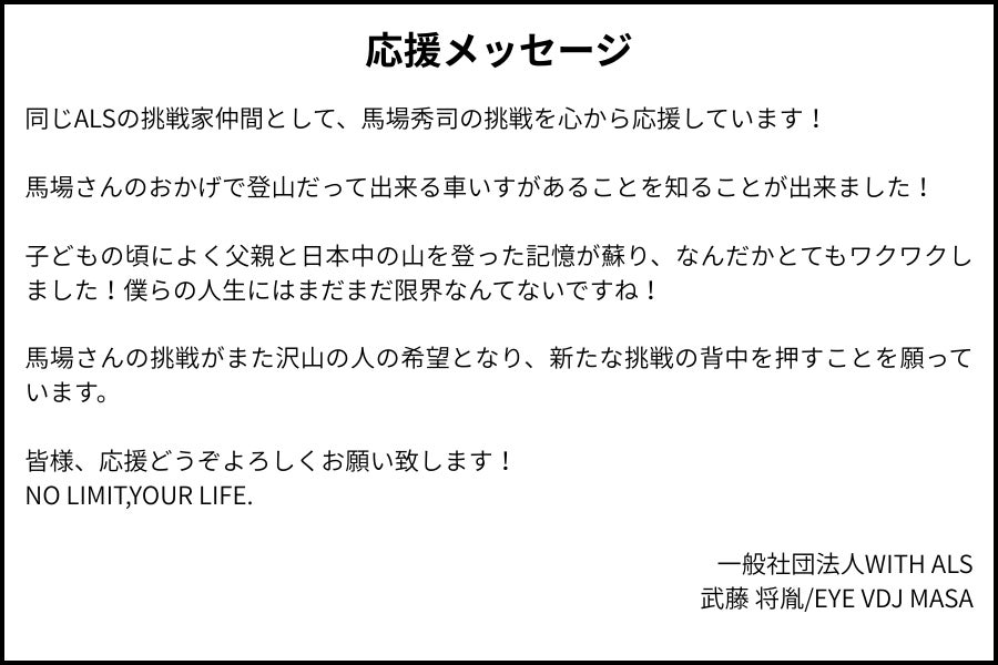 本プロジェクトに大変うれしい応援メッセージをいただいております!今回ご紹介させていただくのは、ALS界のスーパースター一般社団法人WITH ALS 代表 武藤 将胤さんです。武藤さんは、衝撃的にかっこよかったパラリンピック開会式でご存じの方も多いと思いますが、私と同じALSでありながらテクノロジーを駆使して視線で映像と音を操るクリエーターです。私はALS発症したての頃に武藤さんの活躍を知り、絶望の中でどんなに救われたことか!武藤さん、応援ありがとうございます!