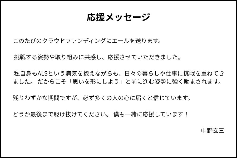 前回の報告に続きプロジェクトにいただいた応援メッセージを紹介させていただきます。今回ご紹介させていただくのは、 中野 玄三エーエルエスさんです。私の憧れの方です。どうしても会いたくて自宅まで伺い、お話を聞かせていただきました。私がALSになってからも希望を捨てずにチャレンジできてるのも、中野さんの発信し続けられてる日々のチャレンジを読ませていただいているからです。いったい何人の方が中野さんに救われたことか。。ALSは過酷な病ではありますが、中野さんはしなやかに、柔軟にALSと向き合われていて、私に新しい視点を与えててくださりました。玄三さん、応援ありがとうございます!