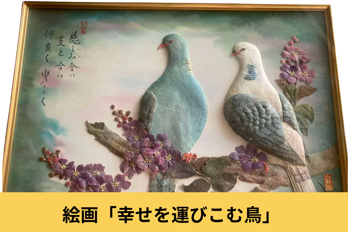 1点物の古典和紙絵画家・荒川夏子の絵画「幸せを運びこむ鳥」の原画をお送りさせていただきます。