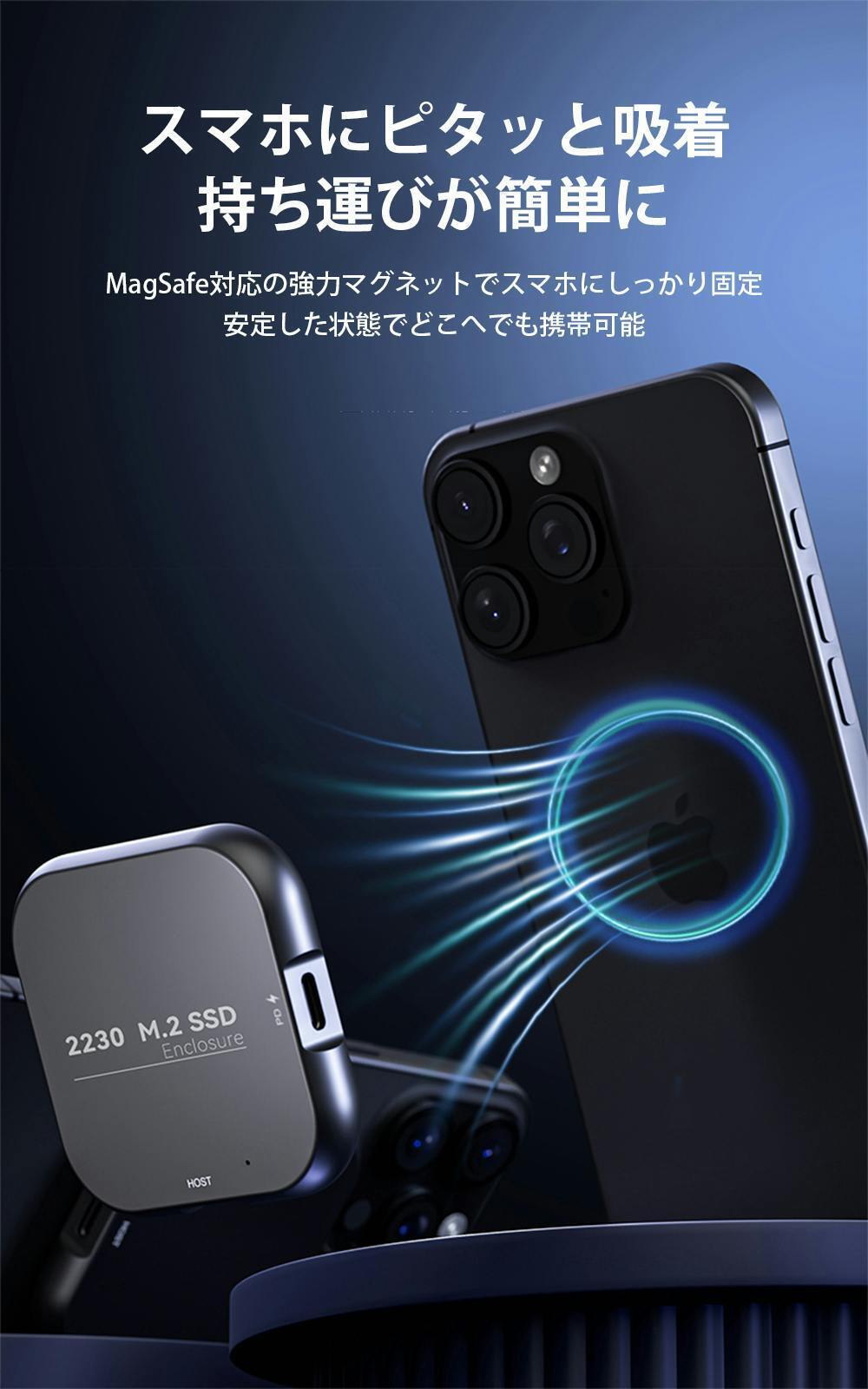 本製品はMagSafe対応しているため、スマホに吸着できて持ち運びが簡単な上、大容量の写真やビデオを簡単に外部ストレージへに移動できるため、スマホの容量不足に悩まさせることはなくなります。