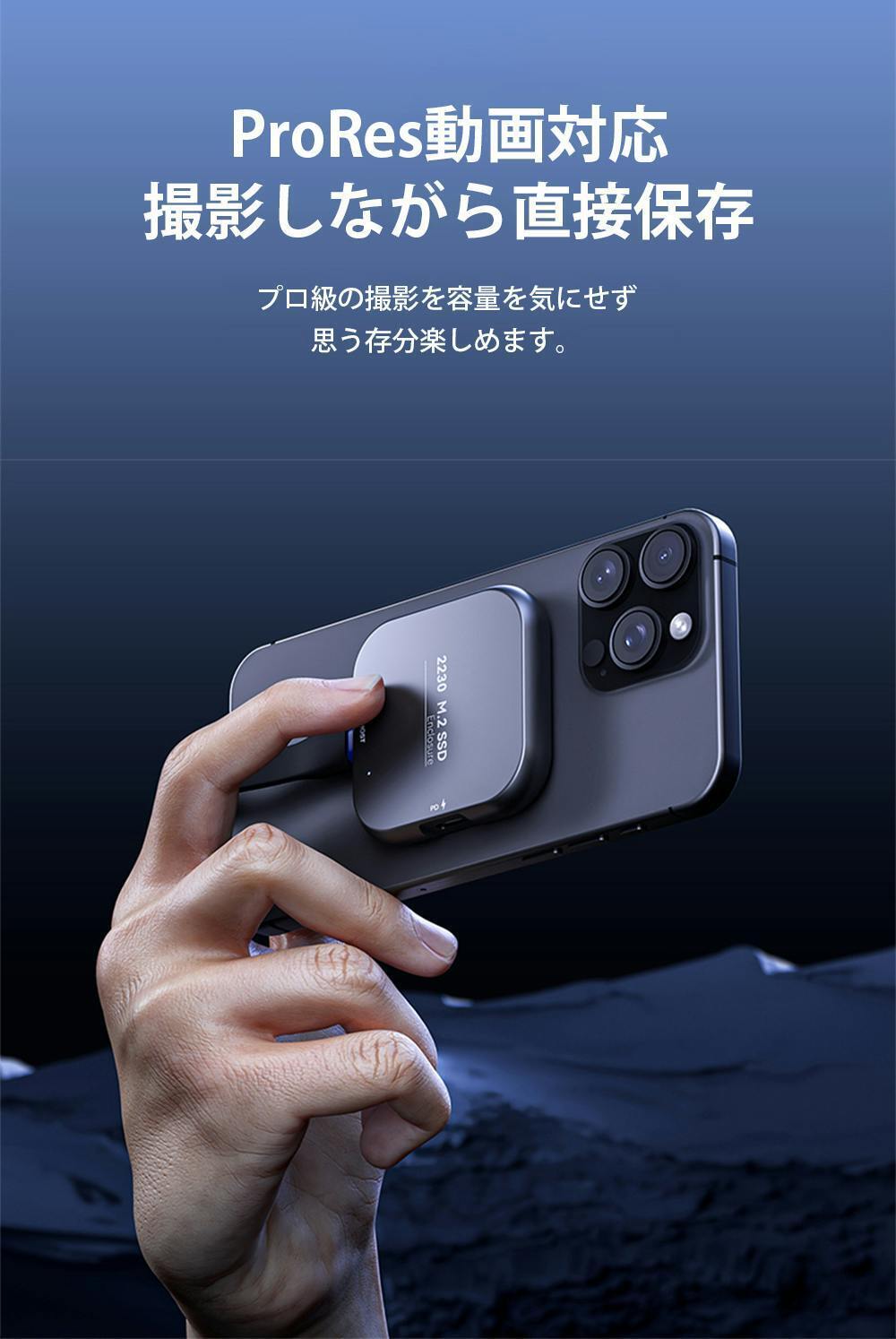 また、Appleが開発した最新式の動画フォーマットであるProResに対応しており、大容量で高画質なProRes動画をリアルタイムで直接外部ストレージに保存できます。