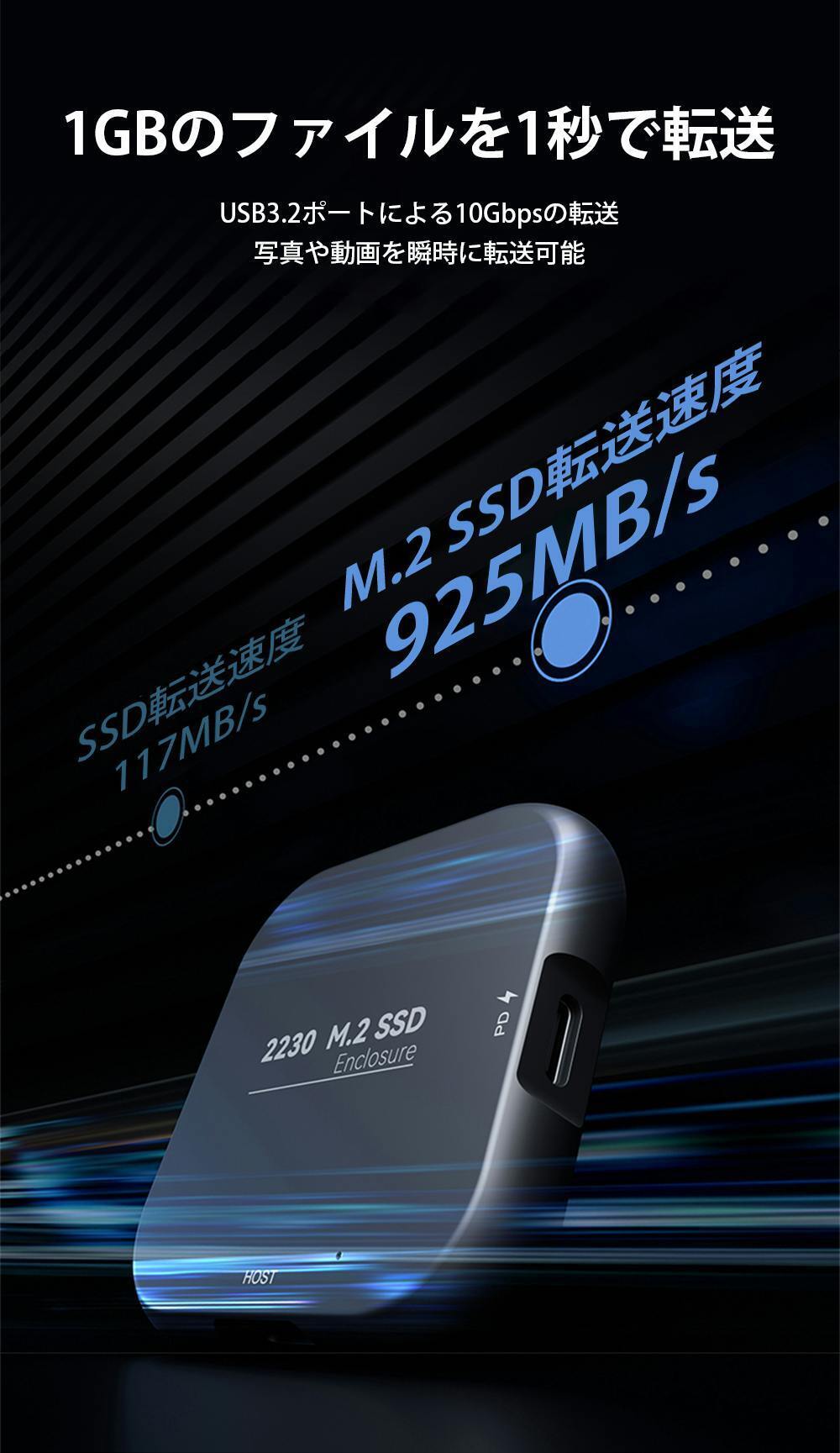 USB3.2 Gen2を採用し、10Gbpsの転送速度を実現しているので、データを瞬時に転送できます。