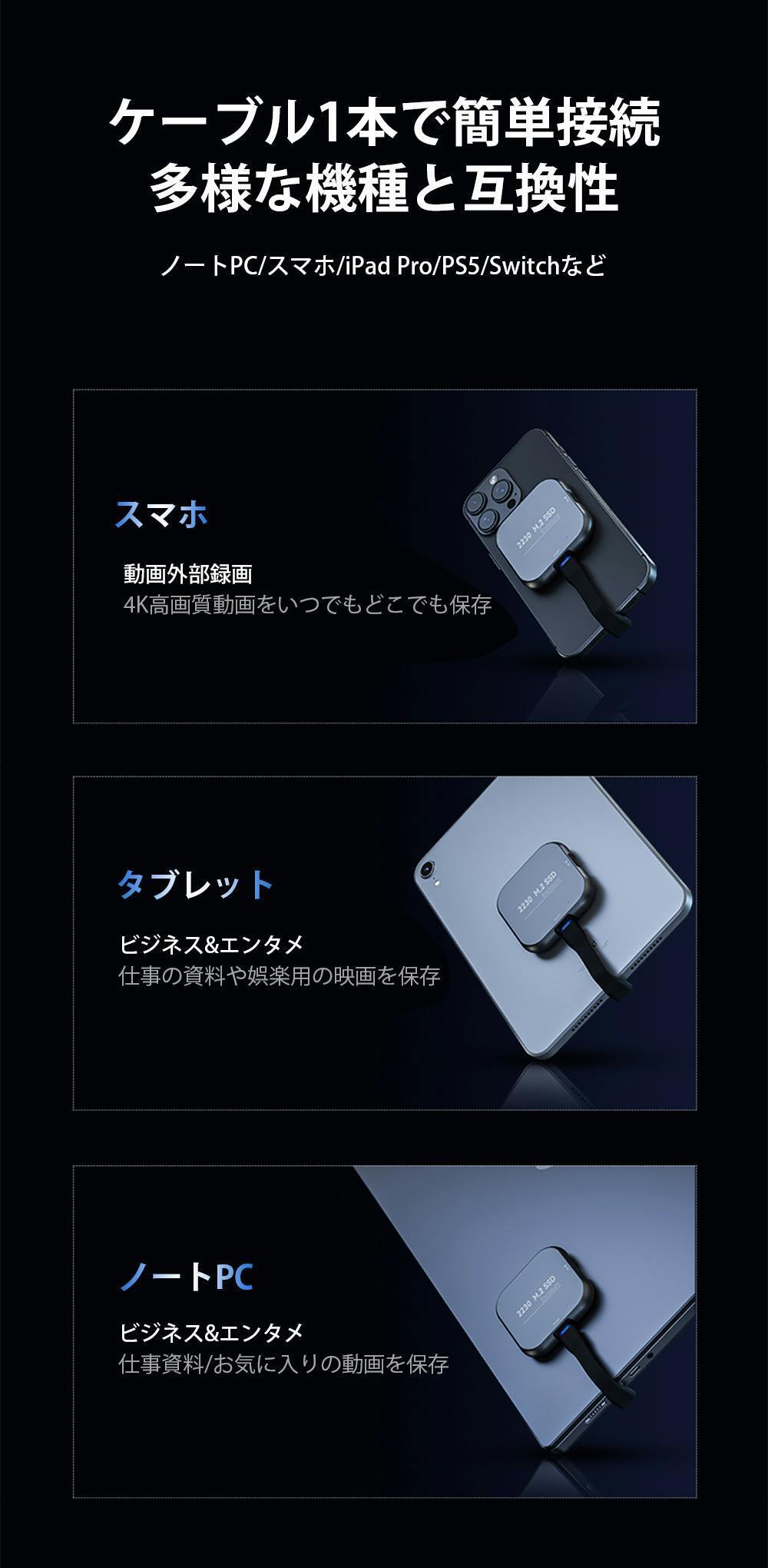 Type-Cケーブル1本で、iPhoneやiPad、Android、PC、Switchなど様々な機種と接続できます。