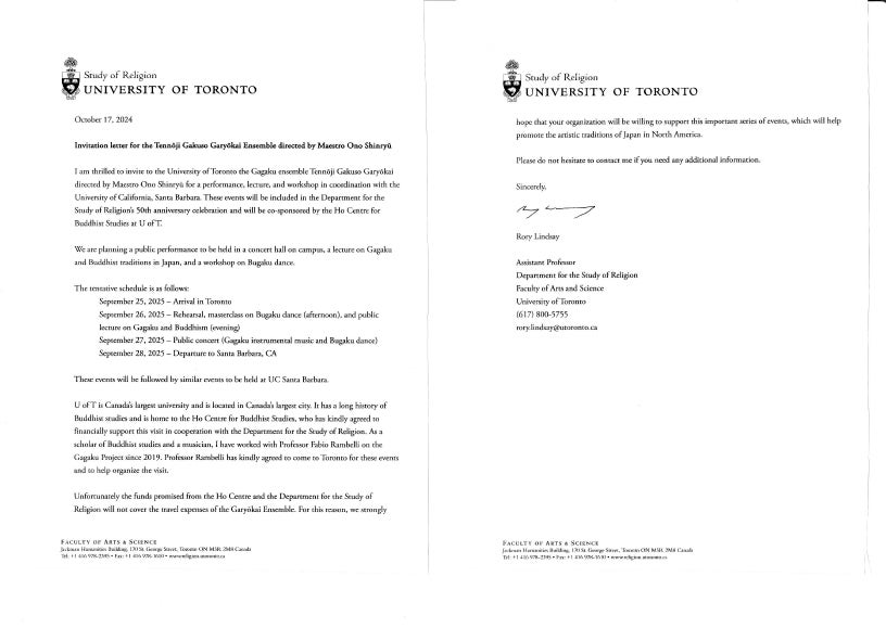 過去に雅亮会はアメリカ・カーネギーホール公演、ヨーロッパ各国、ニュージーランド、韓国、中国、チェコ(大統領臨席)など豊富な海外公演を実施してきました。しかしながらコロナ禍以降は海外公演の機会をなかなか得ることができておりませんでした。この度トロント大学並びにカリフォルニア大学の招へいを受けまして、カナダ、アメリカ両国で天王寺舞楽のレクチャーデモンストレーションを行う機会を頂きました。