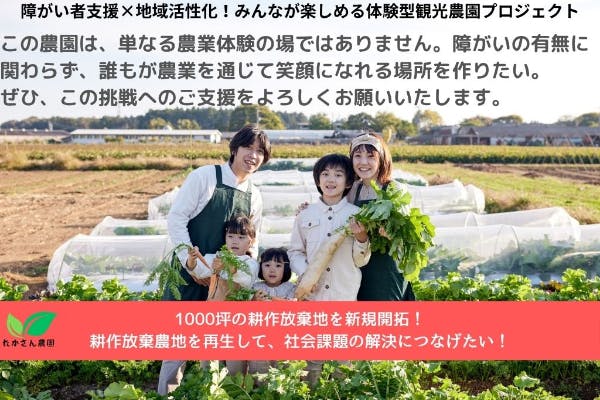 地域には農業資源が豊富にありながら、高齢化や人手不足の課題を抱えています。一方で、障がい者の就労機会は限られています。この農園を通じて、障がい者の自立支援と地域活性化を両立し、持続可能な農業の未来を築くことを目指します。