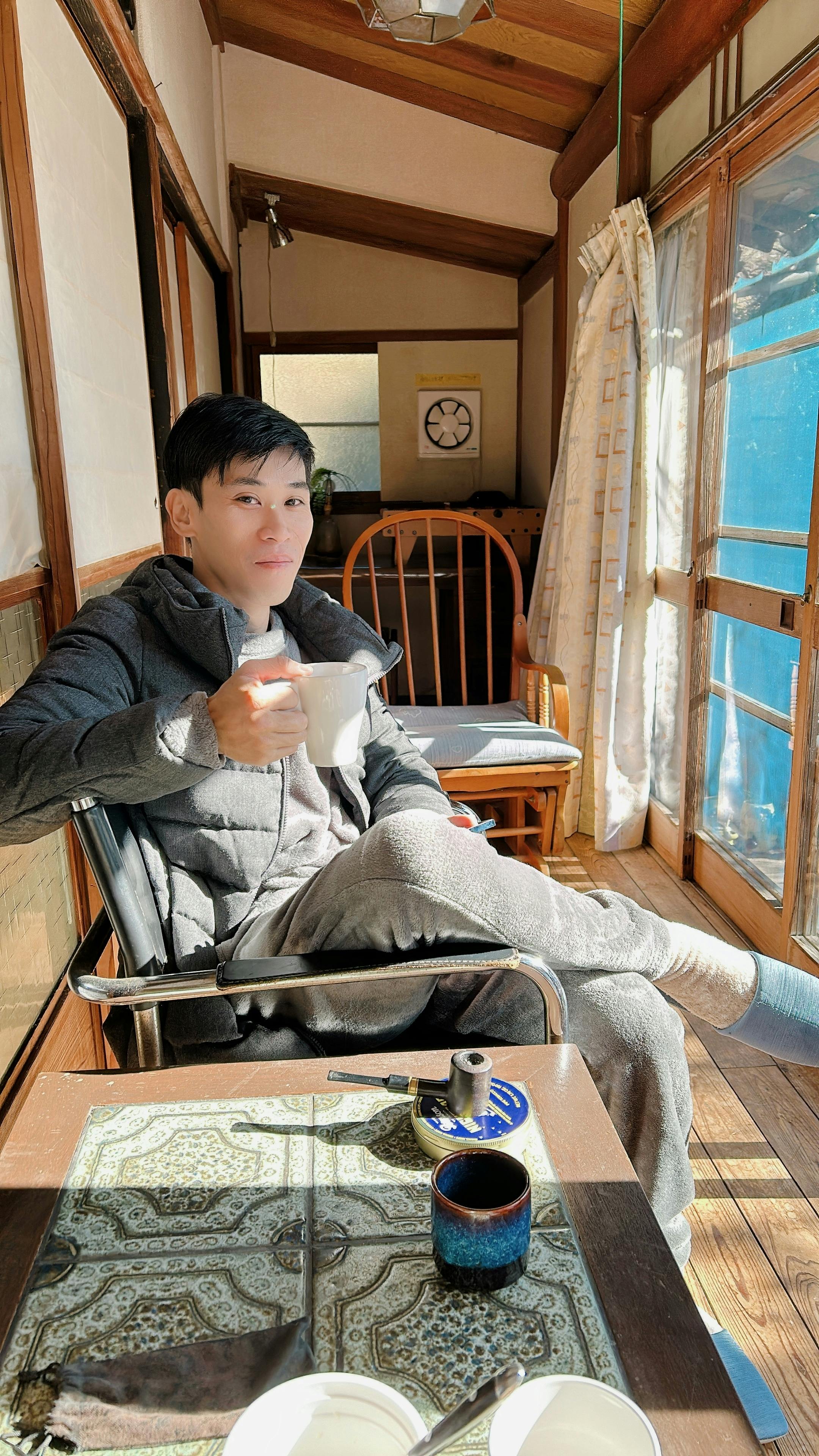 ↓縁側でコーヒーを飲みくつろぐ夫