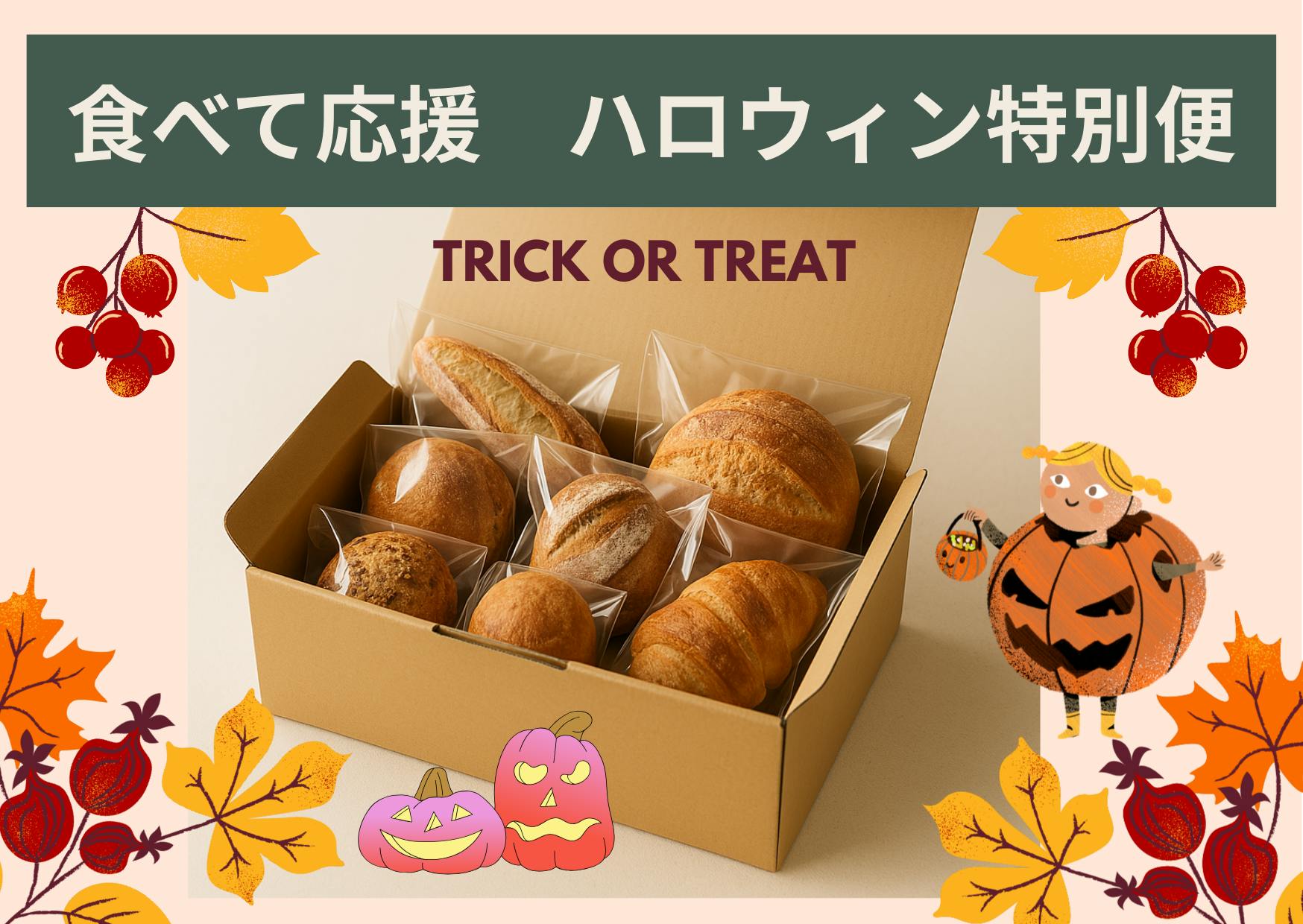 全国のパン屋さんが腕をふるう“推しパン”を、月に一度お届けする定期便です。さらに今回は、ハロウィン特別便をプラス。1回、3回、6回のコースから選べます。応援の気持ちを込めて、日常の中に小さな冒険を取り入れてみませんか。