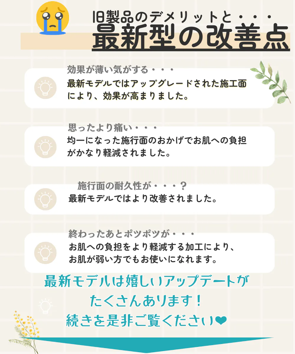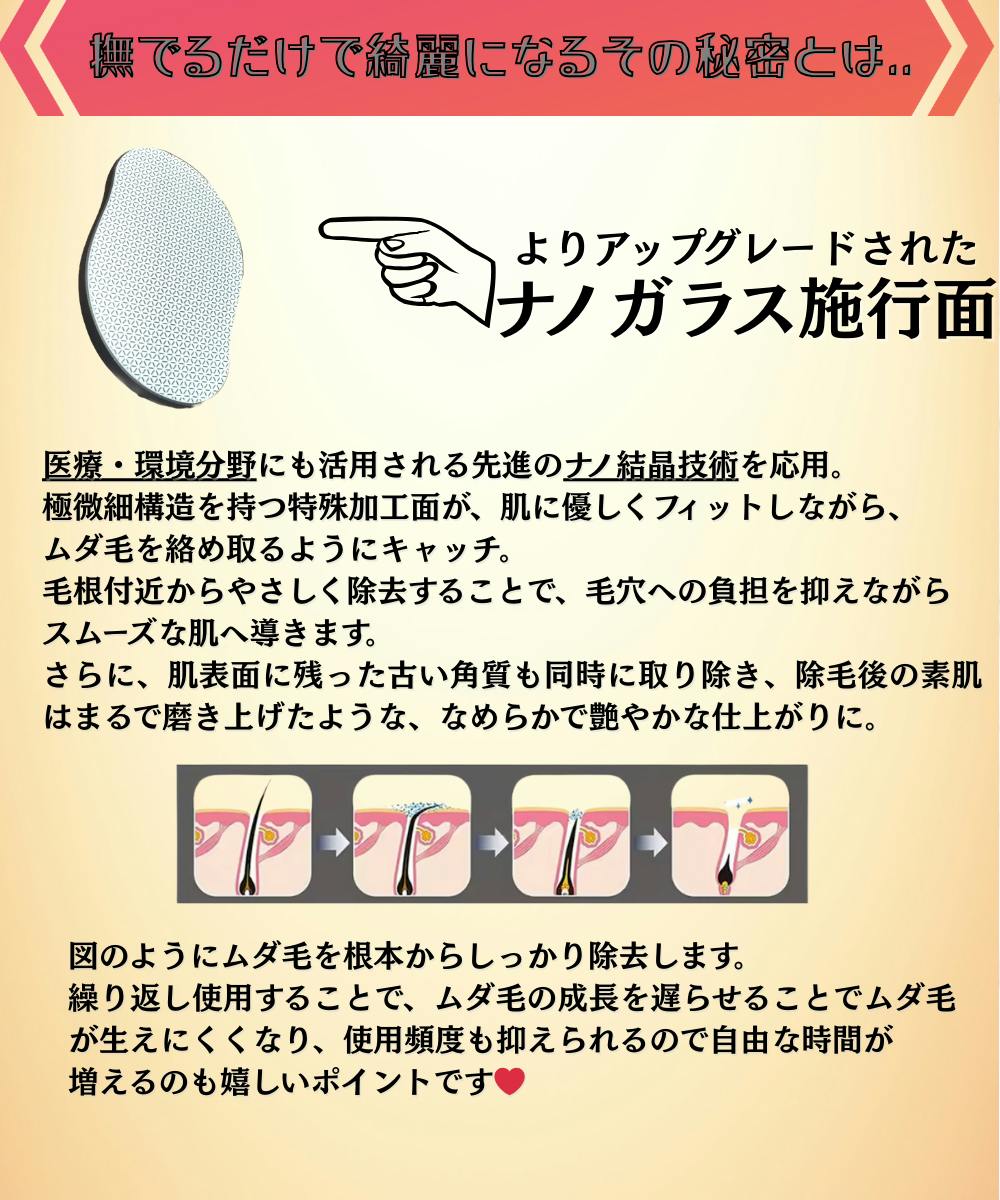 2025/05/07 13:25【除毛プレートが新しくなりました】従来のモデルよりも、プレート表面のパターンがより細かく・繊細に 進化しました!これにより──✔ 痛みがかなり軽減✔ 肌荒れリスクもさらにダウン✔ よりやさしく、スムーズに除毛可能実際にテストでも、「前より更に良い!」「よりスベスベに仕上がる」という声をいただいています。もちろん、除毛力はそのまま。より快適に、より優しく進化した新型除毛プレートをぜひ体感してください! もっと見る