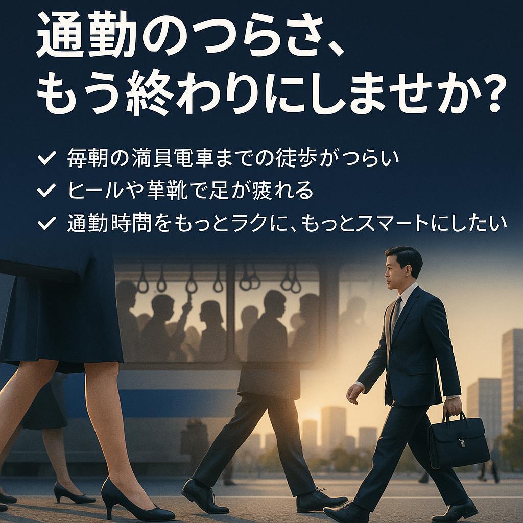 私たちがそれを解決できます。私たちの革新的な電動シューズは、毎日の通勤を快適にし、あなたの移動をスムーズにサポートします。もう、足の疲れや通勤ストレスに悩まされることはありません。