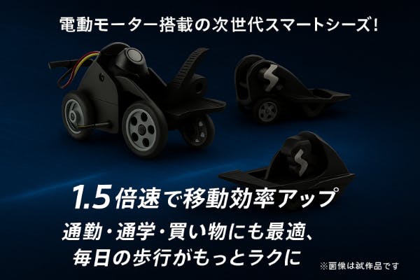 製品は、電動モーターとベアリングを内蔵した“自動で歩行をアシストする電動シューズ”で、通勤・通学・買い物など日常の移動をラクにすることを見込んでいます。
