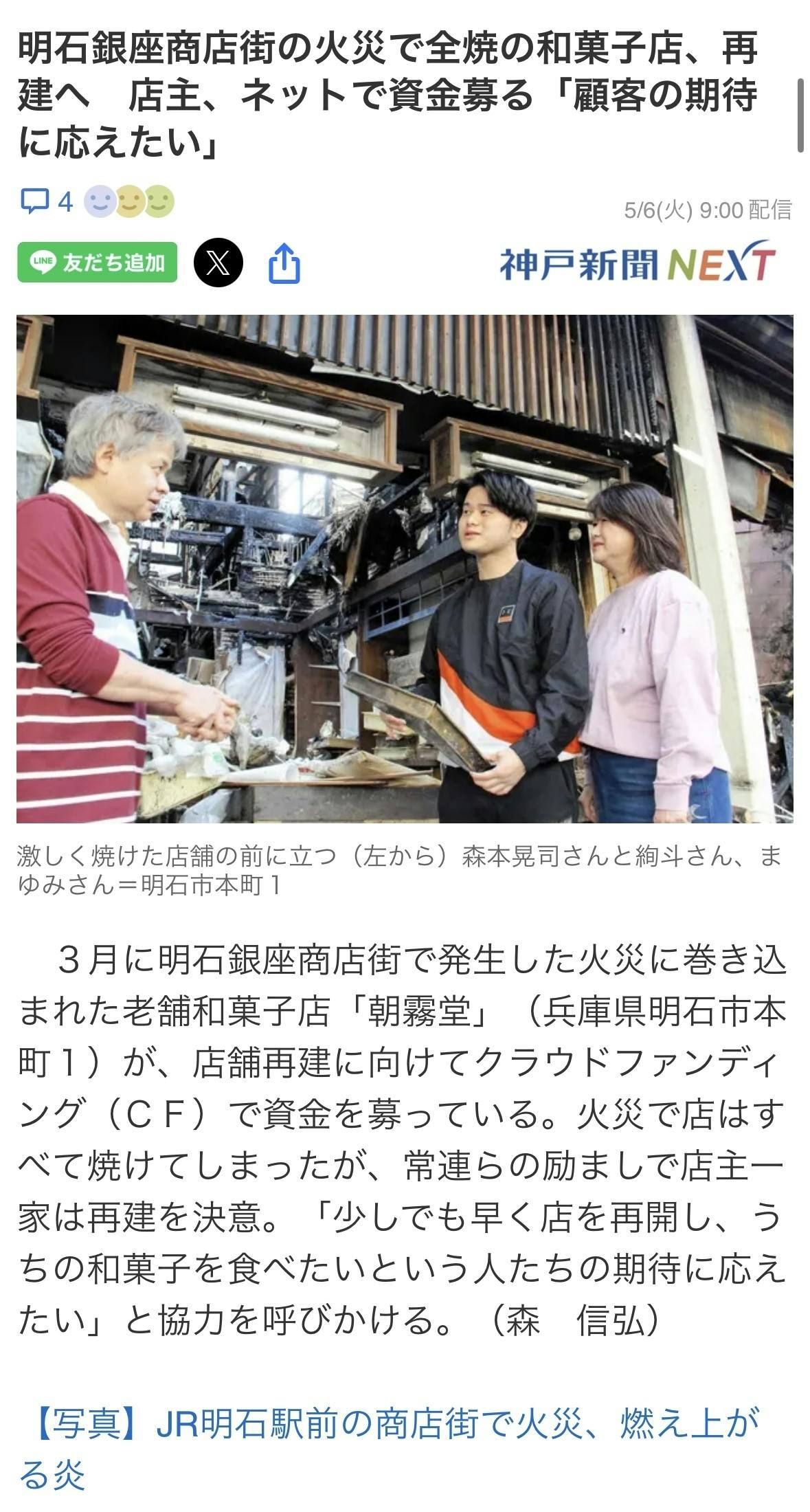 皆さま、いつも温かいご支援をありがとうございます。このたび、私たちの挑戦と想いを「神戸新聞」さんが記事として取り上げてくださいました。火災で失ったもの、そしてそこから立ち上がろうとする姿を、丁寧に取材していただきました。地域の方々や遠方の方にも、私たちの活動を知っていただける大きな一歩です。記事を通して、改めて多くの人に支えられていることを実感し、胸が熱くなりました。これからも「朝霧堂」の再出発に向けて、誠実に一歩ずつ進んでいきます。記事を読んでくださった方、シェアしてくださった方、そしていつも応援してくださっている皆さまに、心より感謝申し上げます。引き続き、どうぞよろしくお願いいたします。