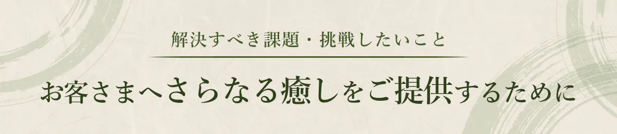 創業以来大切にしてきた癒しの時間をこれからも過ごしていただくために、そしてこれまでよりもさらに成長したおもてなしでお客様をお迎えするために私たちが解決しなければいけない課題。