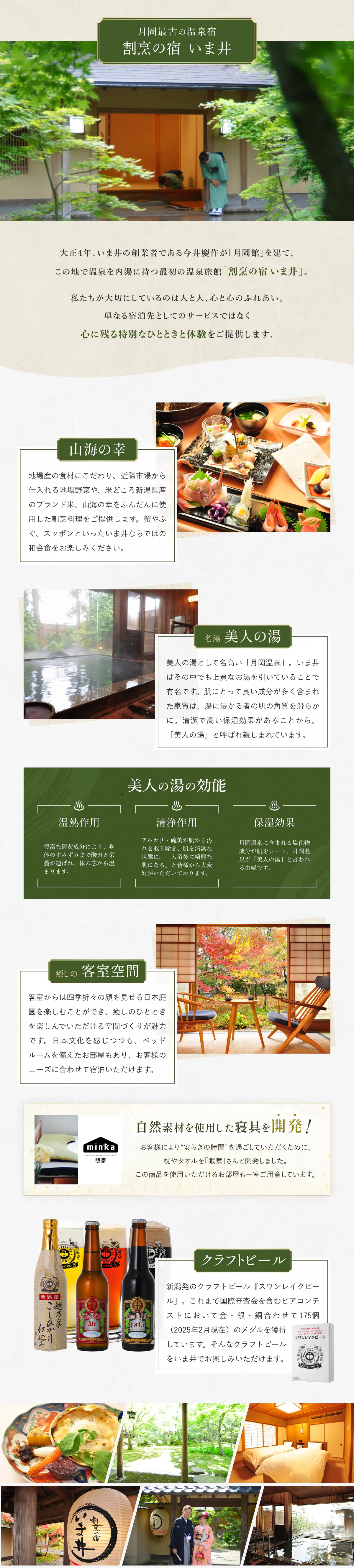 日本有数の“美肌の湯”として知られる月岡温泉の上質なお湯と山海の幸を味わえる会席料理を楽しみ、癒しの時間を過ごせる宿として、創業以来多くのお客様に愛されてきた割烹の宿 いま井。