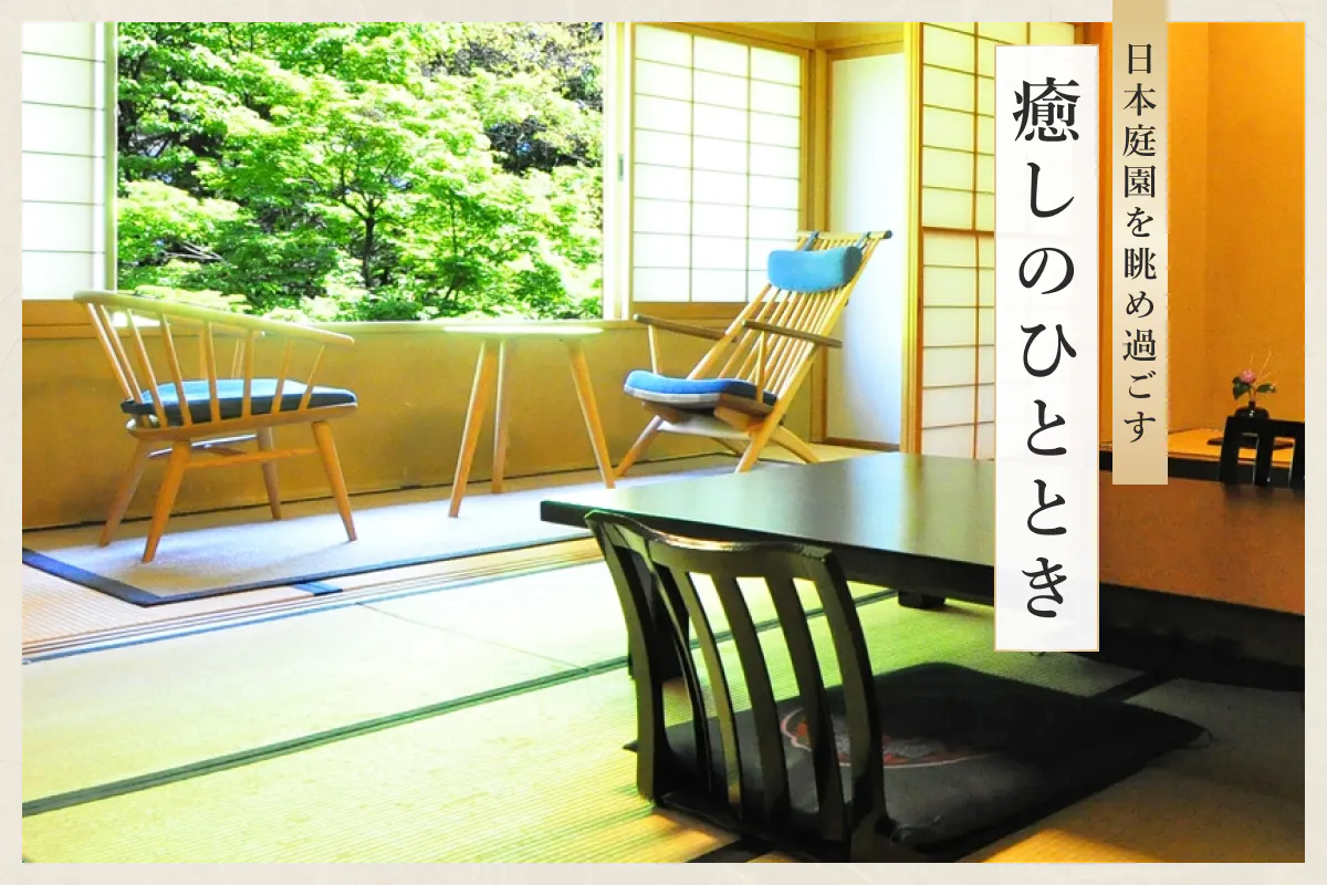 約3,000坪の敷地にも関わらず、部屋数は11室のみ。目の前には日本庭園が広がり、四季折々の景色と静寂に包まれながら、心安らぐひとときを過ごすことができます。