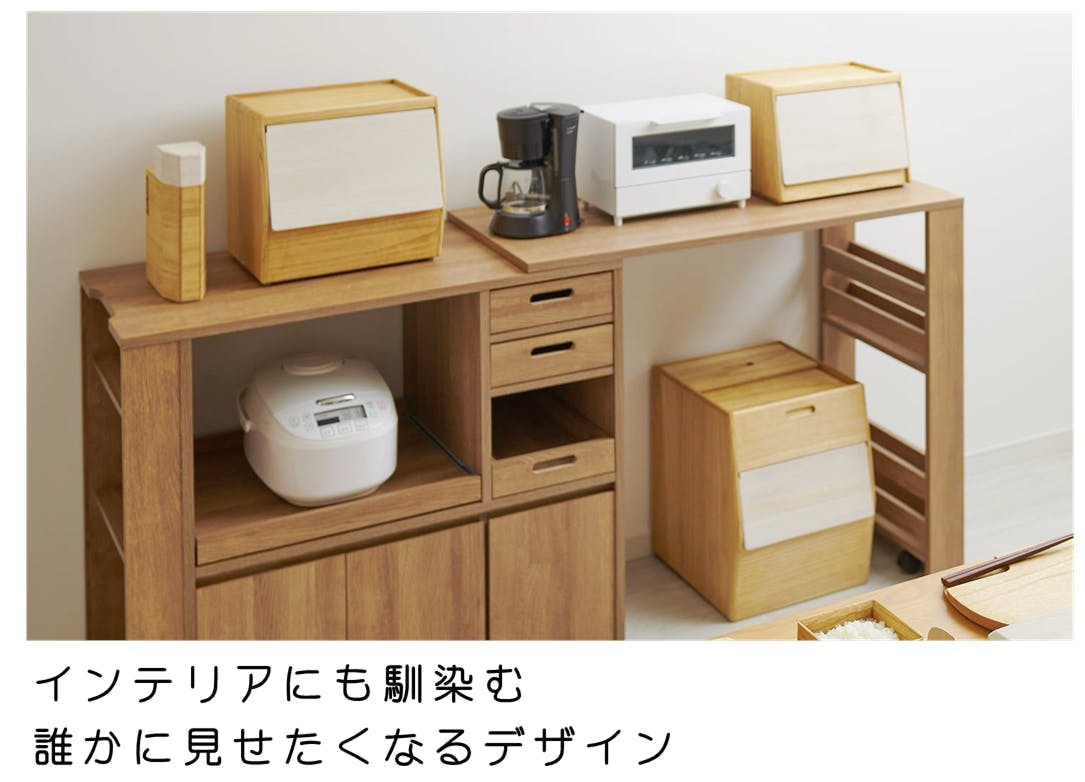 片手で開閉できるフラップ式収納扉を採用。前からお米が取り出せるためカウンターの上に置いても取り出しやすく置き場所を選びません。
