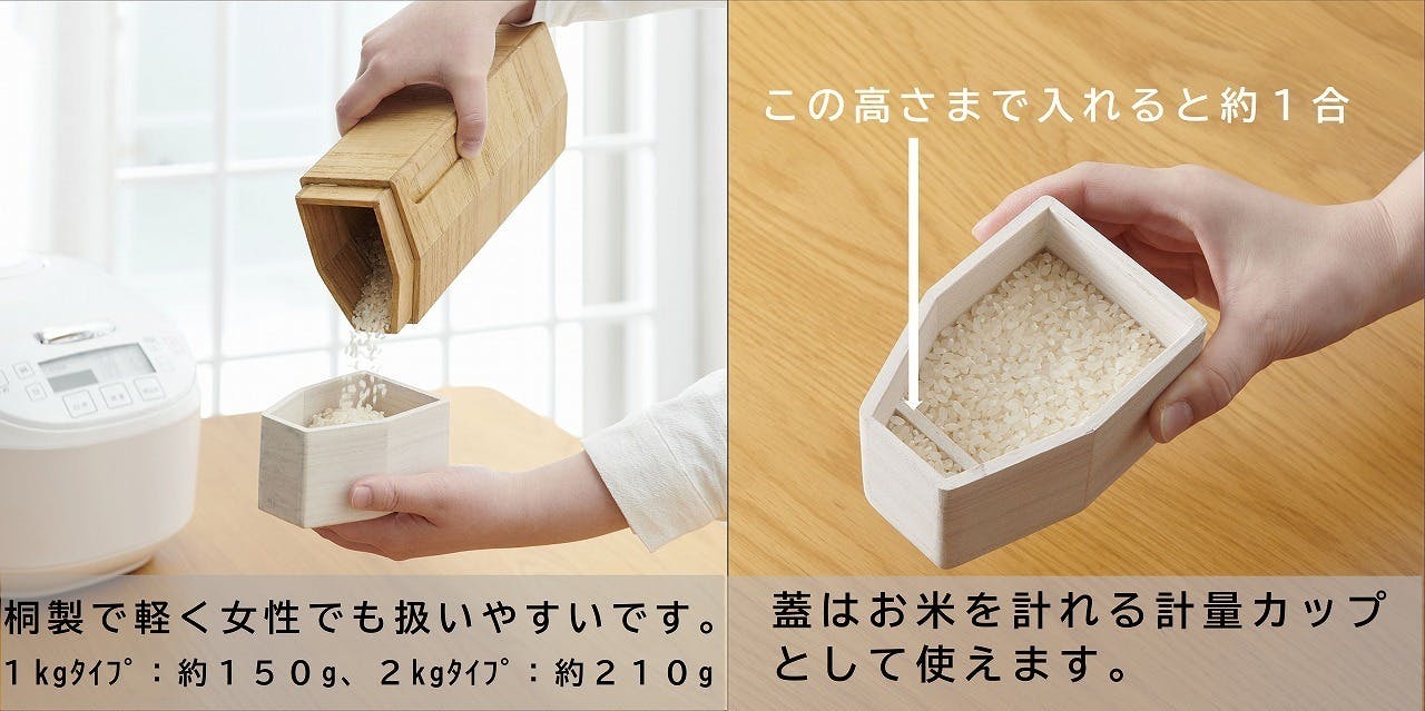 付き、本体蓋はお米を計れる一合マスとして使えます。内側の板の高さまでが約1合となり指ですり切らずに計れます。