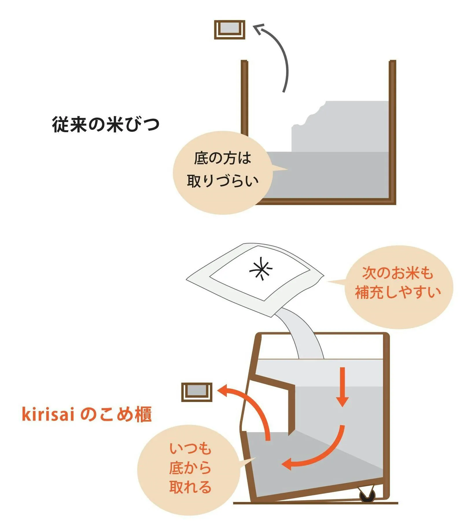 底のお米が前から取り出せる