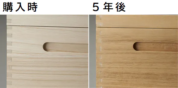無塗装の場合、経年劣化により5年でこれだけの変化があります。よってkirisaiにはドイツ製の自然塗料オスモカラーを採用