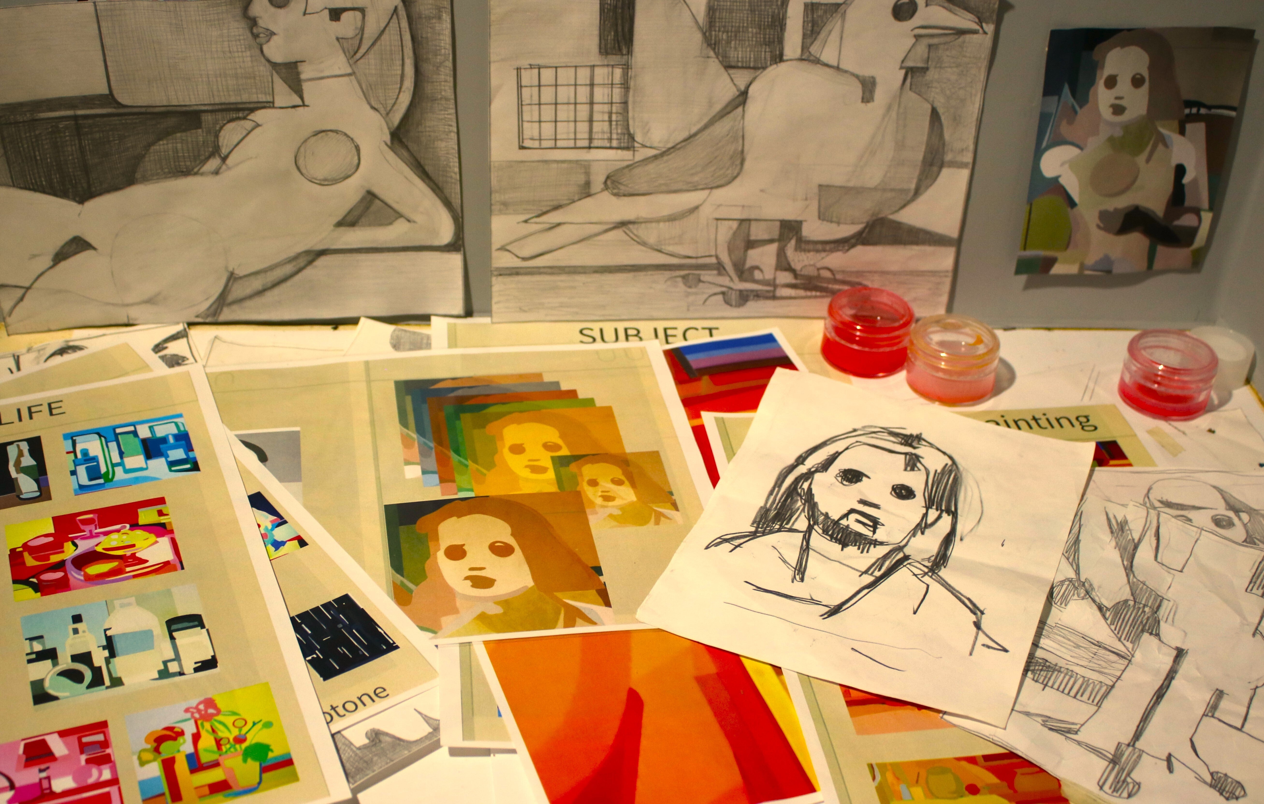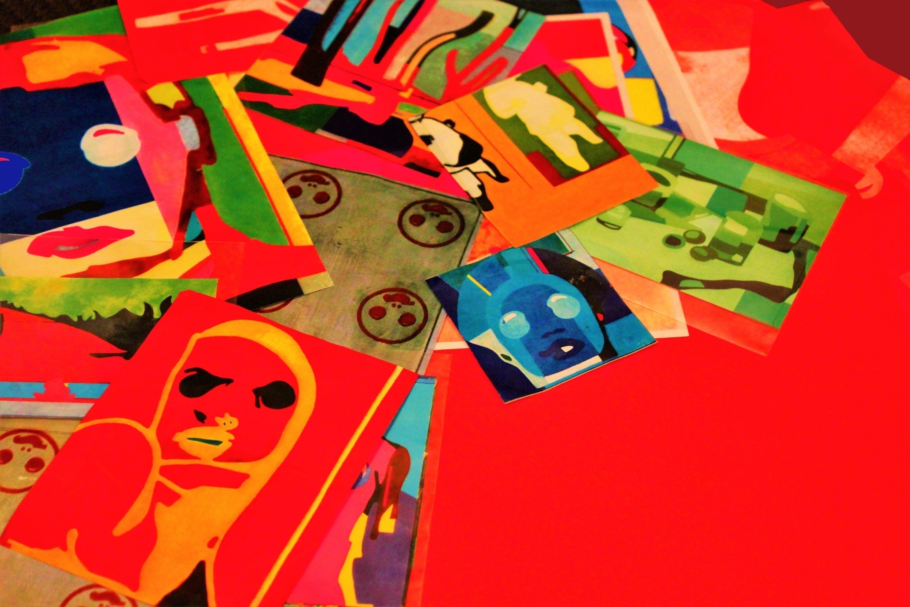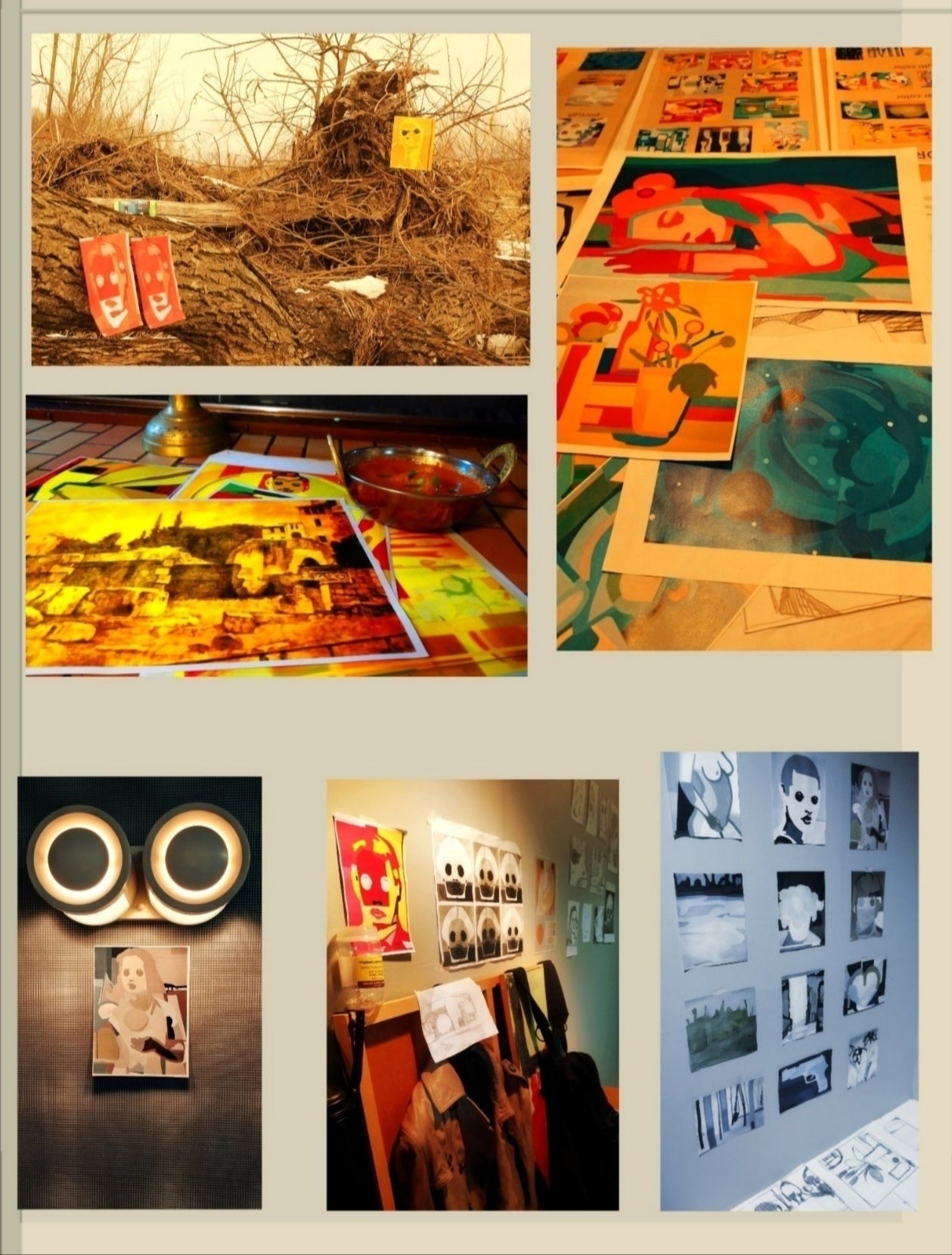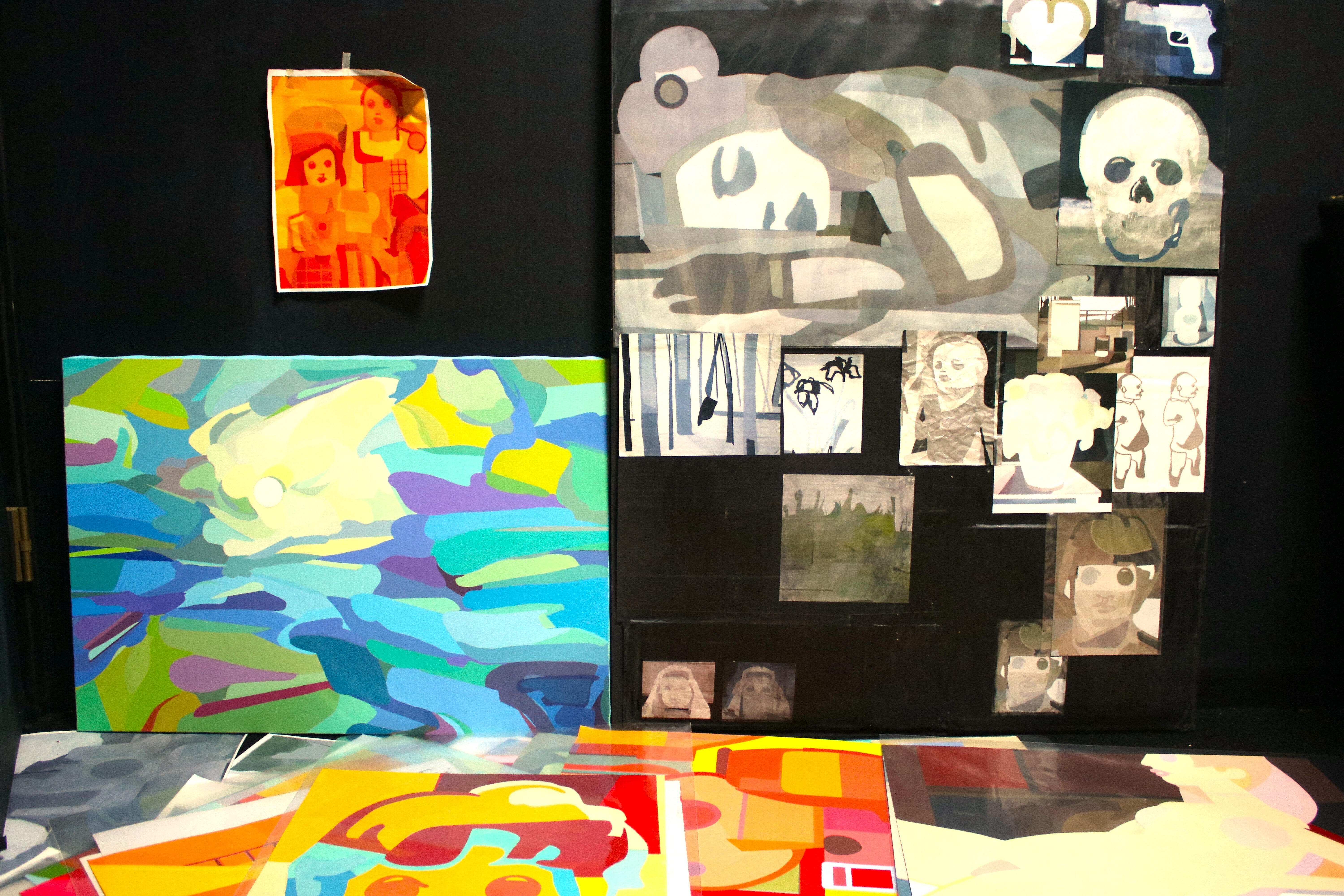 床一面に散らばった絵画イメージのコピーやラクガキの数々