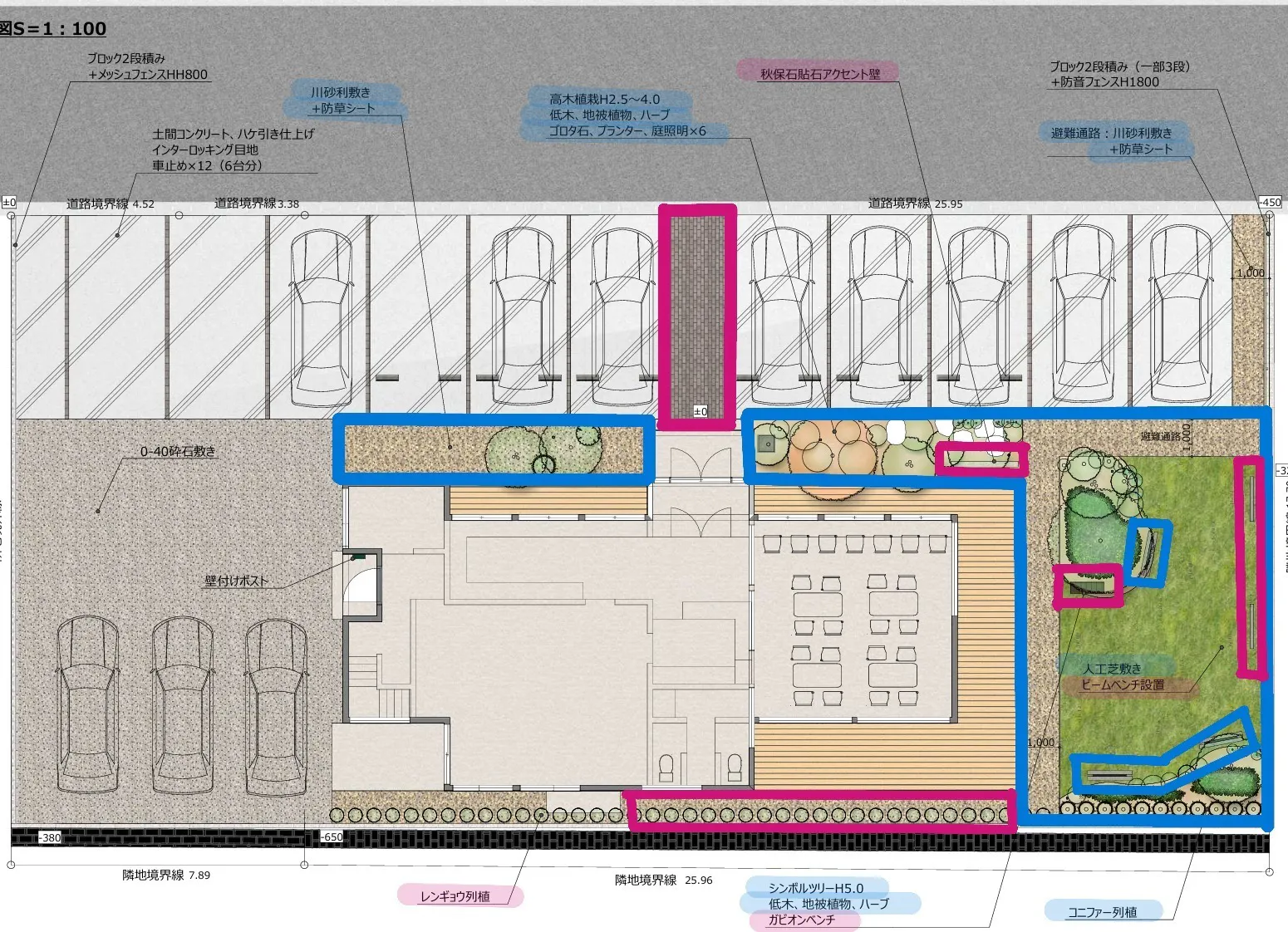 今回のプロジェクトでは店舗東側をメインに心地よい時間を過ごせるお庭をつくりたいと思っています。