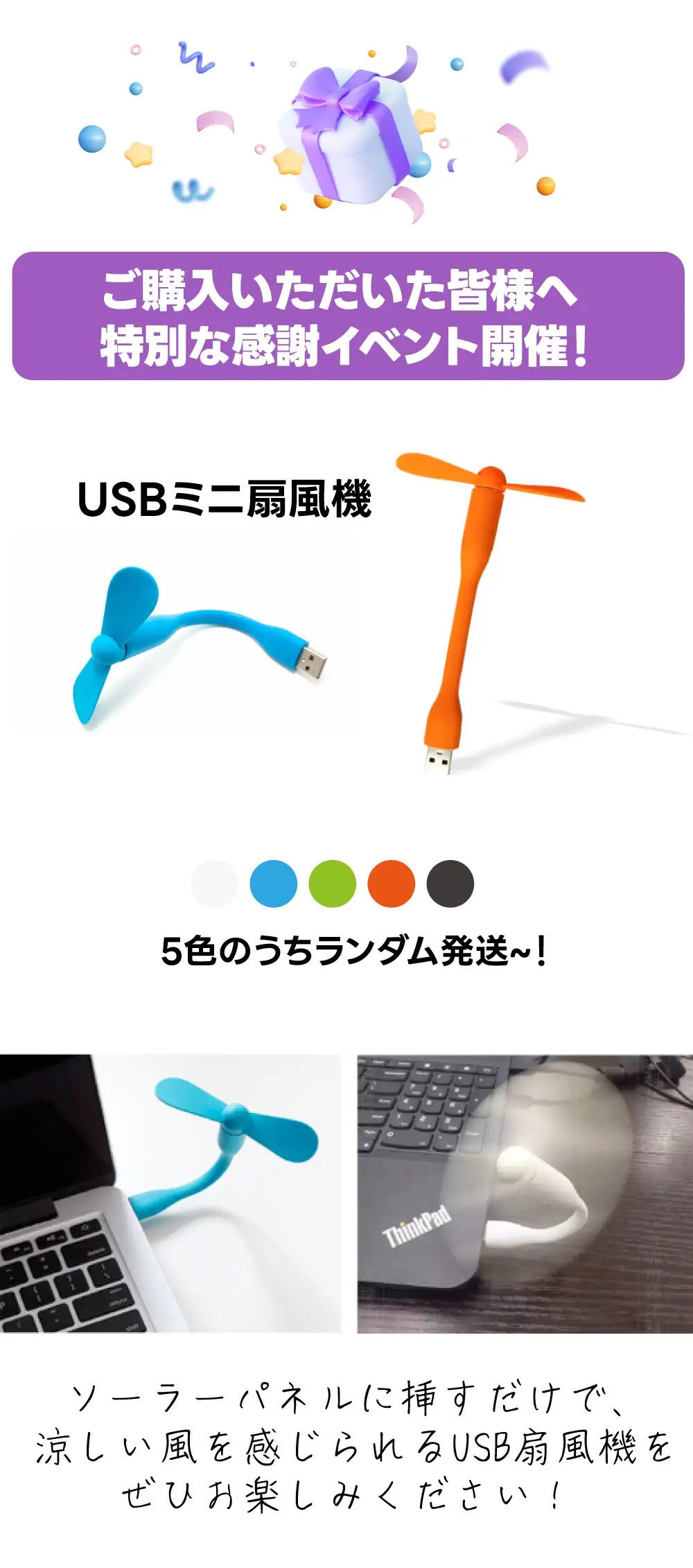 USBに差し込むだけで涼しい風が楽しめる、**ミニ扇風機(550円相当)**を1セットにつき1個プレゼントいたします!