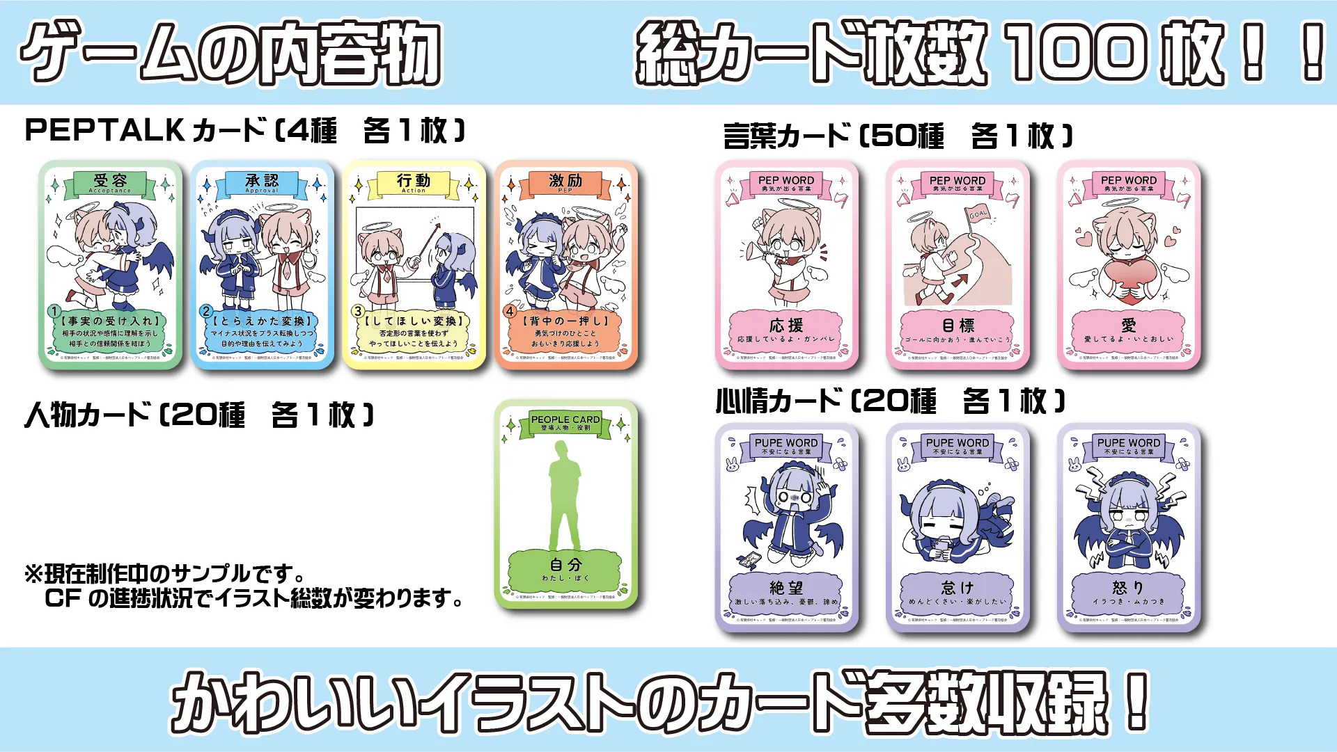 皆様から集まった支援金を元に製造販売を行い、【ペップトーク】の技術を多くの人に普及できれば嬉しいな!って思ってます。ストレッチゴール次第では、たくさんのイラストが採用された、豪華なカードゲームになります!