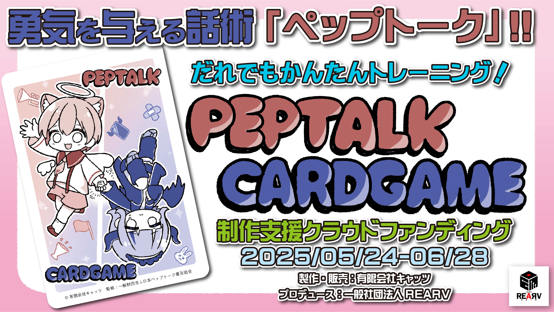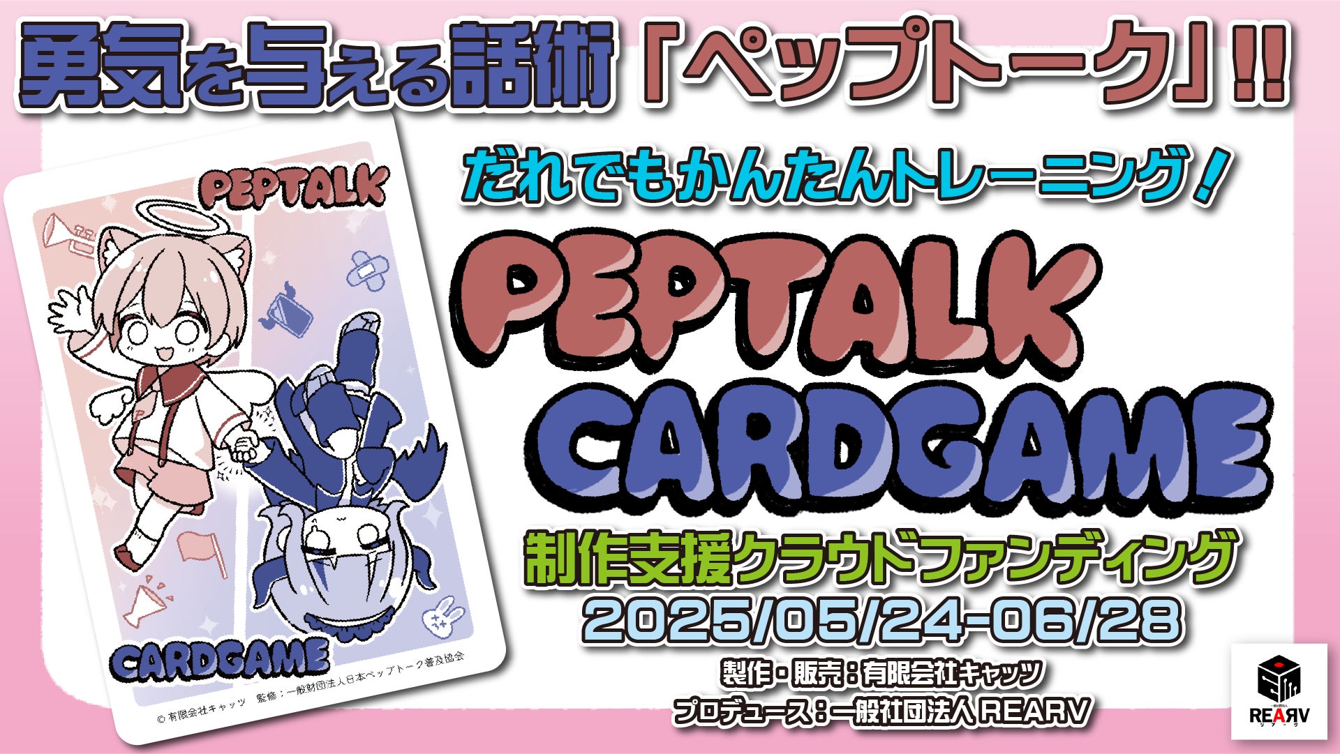 REALとVRをA:アナログゲームでつなぐ!一般社団法人REARVのとむこです。今回、VRChatで良い出会いがありまして、リアルでのカードゲーム制作を行うこととなりました。付きまして、その制作費用を集めるためのクラウドファンディングを開催しております。出会った方は「一般財団法人 日本ペップトーク普及協会」のあんでぃ先生で、「ペップトーク」というスピーチ話法やコーチングスキルを指導、講演されている団体に所属されて居られます。ペップトークは、とっても簡単で、【受容】【承認】【行動】【激励】の4つのステップを意識しながらしゃべるだけで相手と仲良くなったり、勇気づけることができる素敵な話法です。実際、協会の代表である岩崎由純さんの講演は聞いているだけで楽しくなってくる、素晴らしい講演でした。古い動画になりますがよかったらぜひみてくださいね。そして、イラストレーターの方もなんとVRChatで出会った絵師さんで、「めいめい先生」という大人気イラストレーターさんを起用させていただきました。とっても可愛らしいキャラクターを新規にデザインして頂きました。心より感謝申し上げます!本当に素敵な出会いに恵まれて、おかげさまで非常に楽しい制作活動を行えています。今回のクラウドファンディングでは、製造費を集める目的と、皆様の反応を伺うことで製造数をセッティングできると思い、あんでぃ先生とともに開催を決めました。また、クラウドファンディングの支援金額に応じて、採用するイラストの枚数も最大で100枚近くになる予定です。非常に豪華なカードゲームになると思いますので、ぜひとも応援して頂けると嬉しいです。また、100万円到達した際には、これらのイラストを素材集としても提供したいと考えています。プレゼンテーションや資料制作で非常に便利な素材集になると思いますので、応援をよろしくでお願いします!