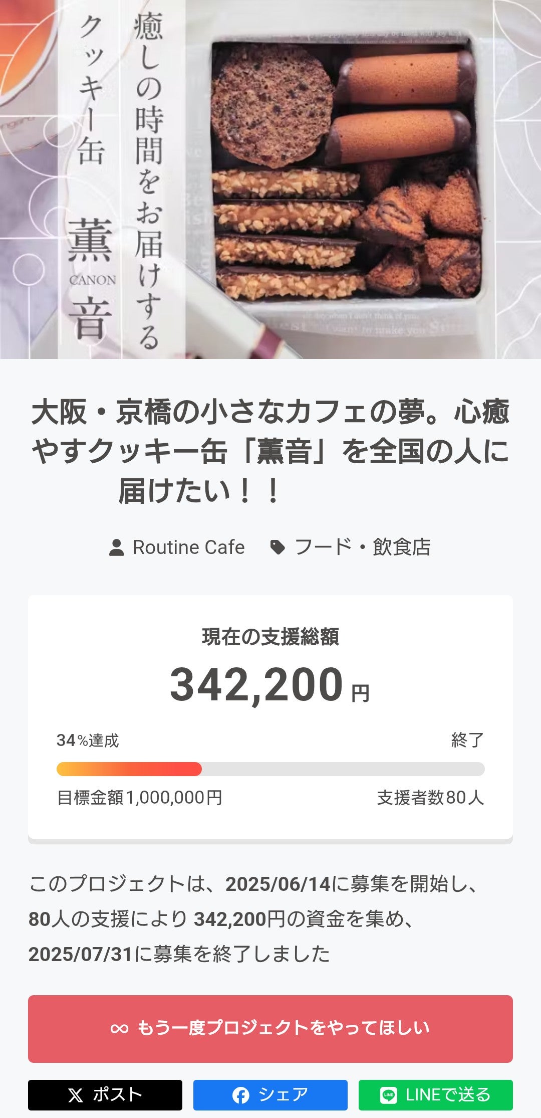 2025/08/01 13:19昨日7/31(木)に無事、Routine Café 「クッキー缶【薫音-CANON-】を全国の人に届けたい!」プロジェクトが終了となりました!沢山のご支援ありがとうございました☆結果としまして延べ【80名】、総額【34万円】もの支援者さま・金額が集まりました!オンラインショップ開設前の段階で、クッキー缶とRoutine Café にご興味を持って頂いた方が、全国にいらっしゃる…とても光栄で嬉しく思いますm(__)mさて、そのオンラインショップでございますが、実は既に構築準備をしておりました☆通販ページに関しては、このクラウドファンディングでご購入頂いた商品の発送が終わり次第、OPENとさせていただきます!Routine Café 店舗のお知らせを、新しいサイトで発信していきますので皆さまぜひ、定期的にチェックをお願いします(^^)Routine Caféの新サイトはこちら もっと見る