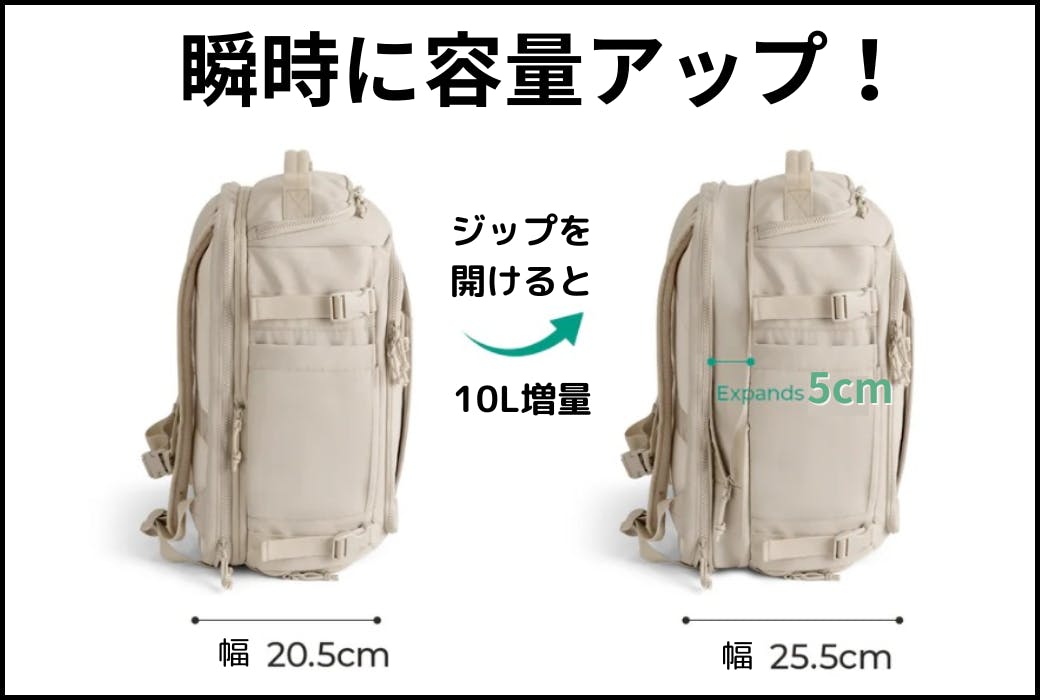 荷物が増えたときにも、サイドジッパーを開けるだけで容量アップ。