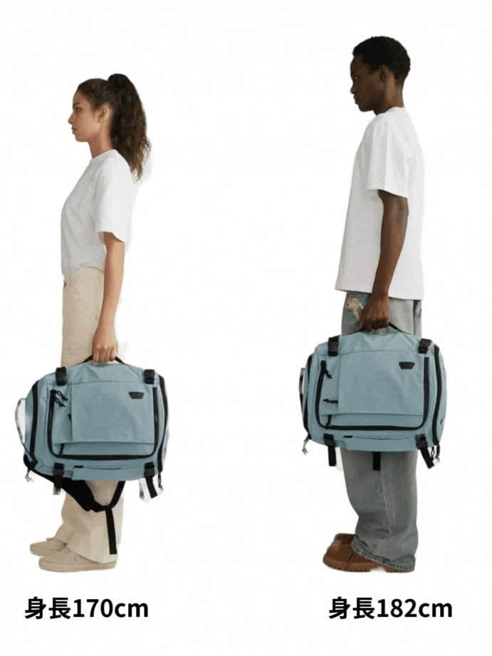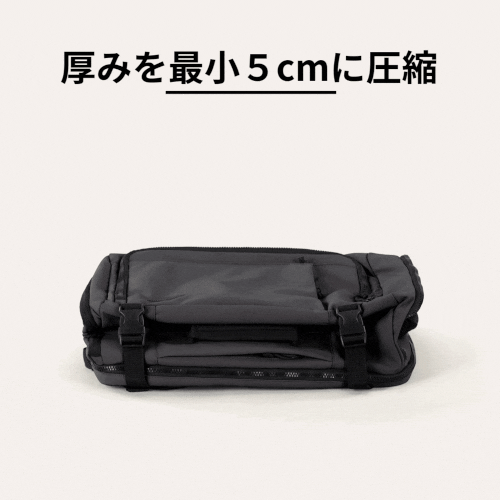 A4. サイドのストラップを調整することで、バッグの厚みを最小5cmまで圧縮できるため、荷物が少ないときにもコンパクトに持ち運べます。状況に応じてバッグのボリュームを変えられるため、普段使いから旅行まで幅広く活用できます。