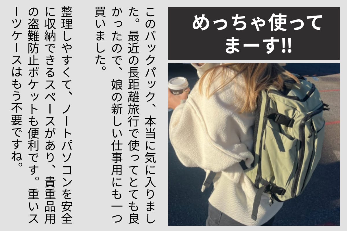 「めっちゃ使ってまーす! スーツケースの様な使い方なのに、リュックタイプっていうのがとても気に入ってます!」