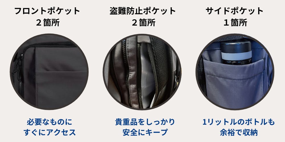 A3. クイックアクセスポケットは、すぐに取り出したいアイテムを収納するのに便利なスペースです。パスポートやスマートフォン、チケットなどを入れておけば、空港や旅先でバッグを開ける手間なくサッと取り出せます。これにより、旅がさらに快適になります。