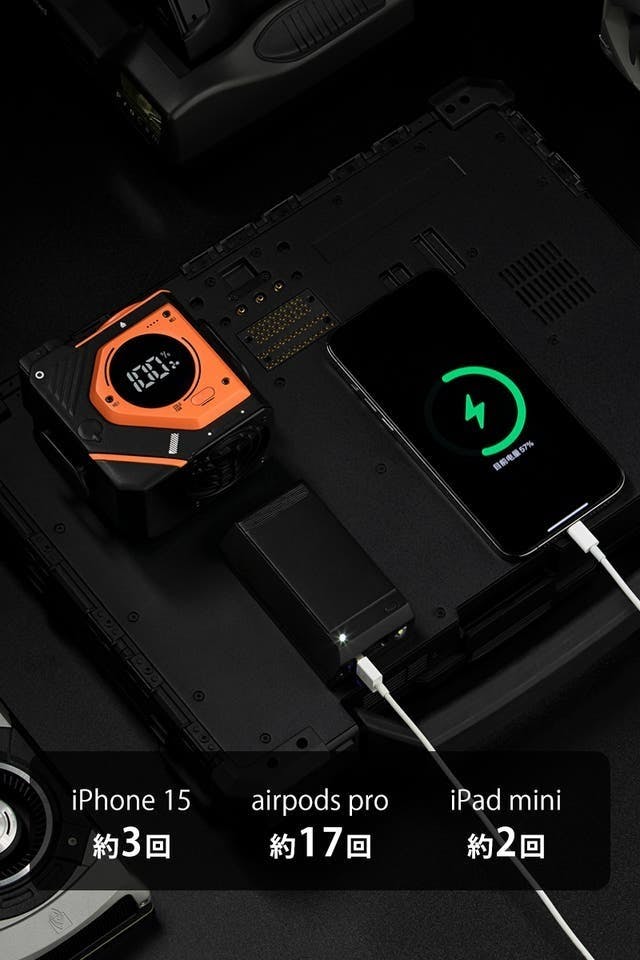 バッテリーは扇風機に分解して使用でき、扇風機を使用しない時にはモバイルバッテリーとしても利用できます。スマホなどのデバイスを充電でき、外出時の荷物を減らすことができます。