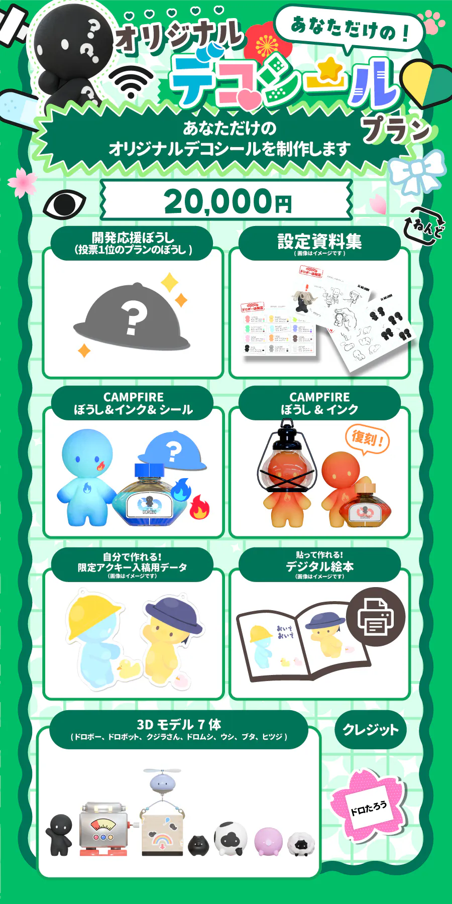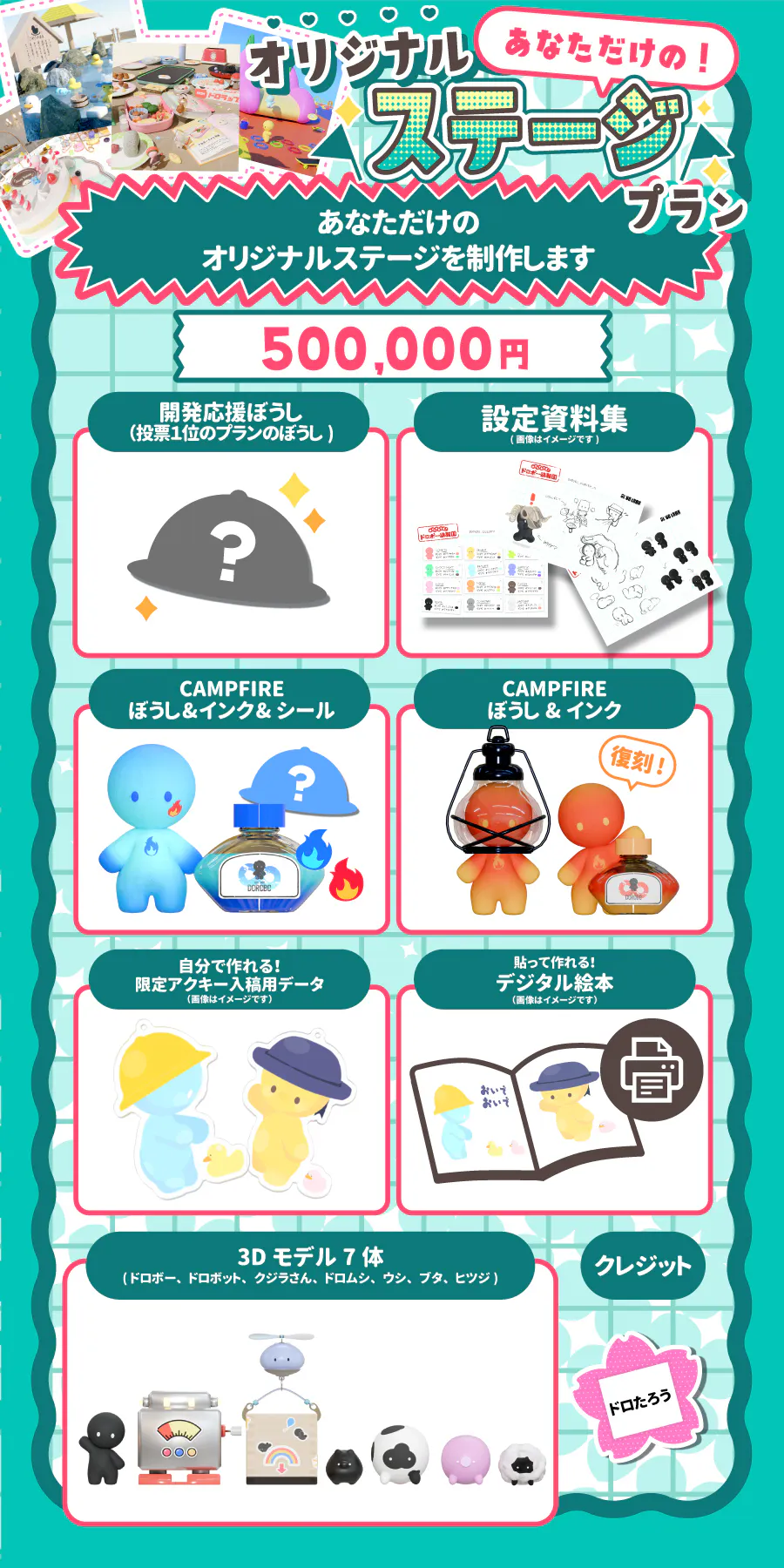 CAMPFIRE限定アイテムをはじめ、ゲームに登場するキャラクターたちの3Dモデルや、デジタル絵本など、制作費換算で支援金以上の価値のあるものを企画いたしました。どれもここでしか手に入らない魅力的なアイテムばかりです。