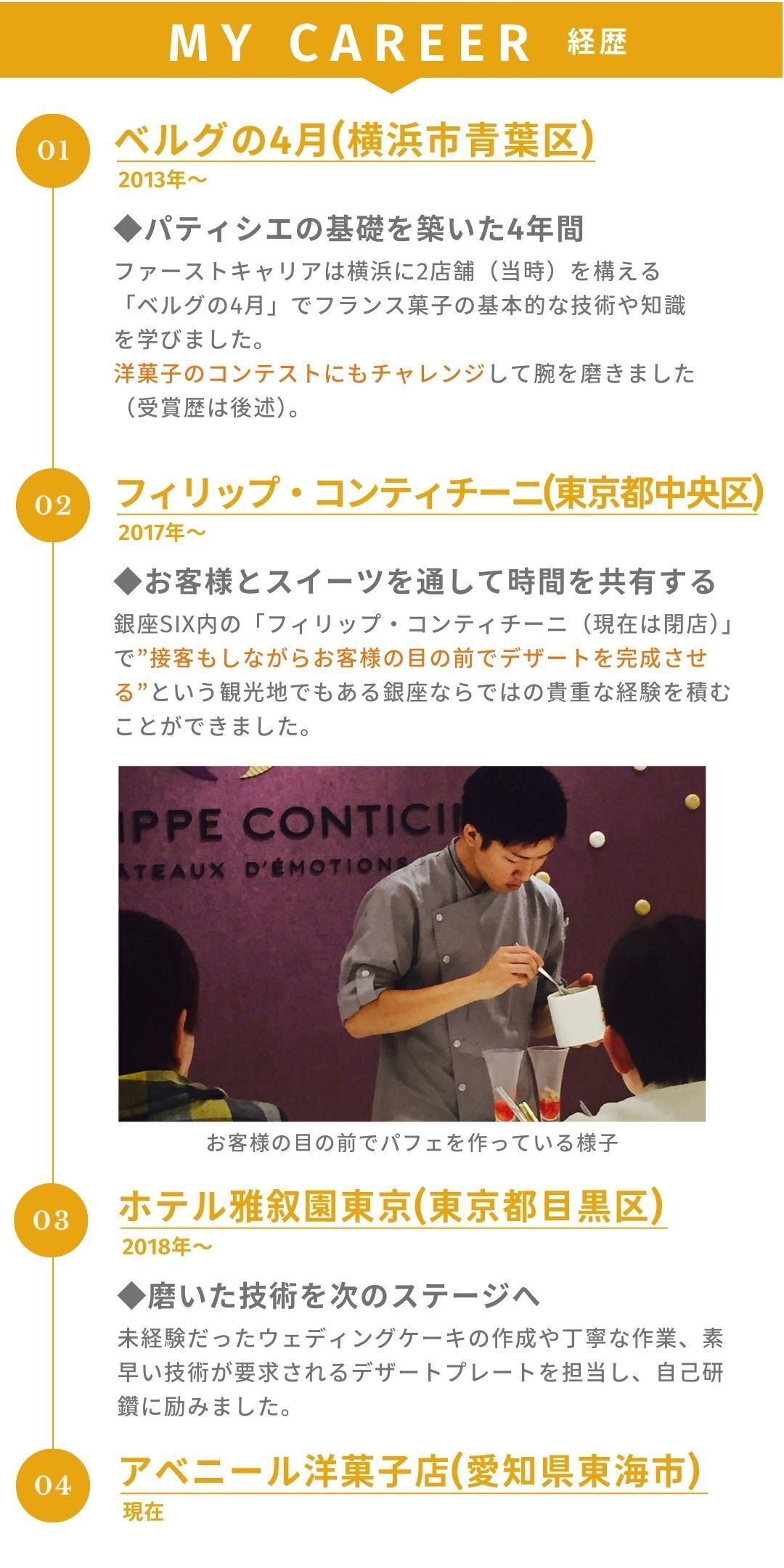 専門学校にも通っておらず基礎もできない私でしたが、神奈川・東京で修行させていただいた7年間でとても多くのことを学ぶことができ、身につけた技術や培った経験を現在はアベニールでのお菓子作りに活かしております。