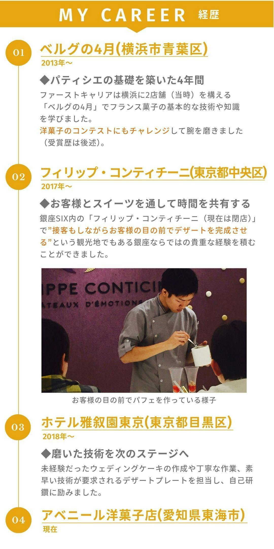 父にパティシエになることを相談すると、本格的なフランス菓子や最先端の技術を学ぶため地元ではなくスイーツの激戦区でもある首都近郊で修行したほうがいいとアドバイスをもらい、単身で上京をすることを決意しました。