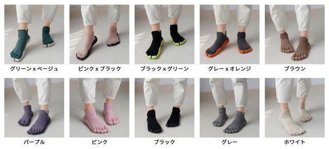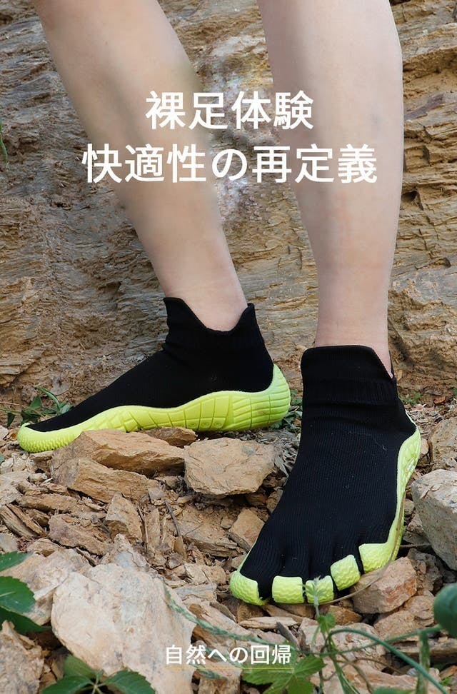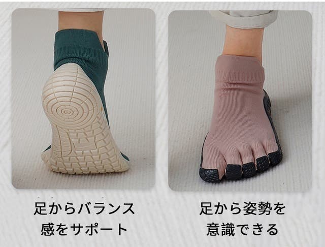 自然な足の形状を模倣し、足指一つ一つを個別にサポートする五本指設計。この革新的なデザインは、足の筋肉や関節をより自然な状態で活動させ、力強い運動に最適なサポートを提供します。