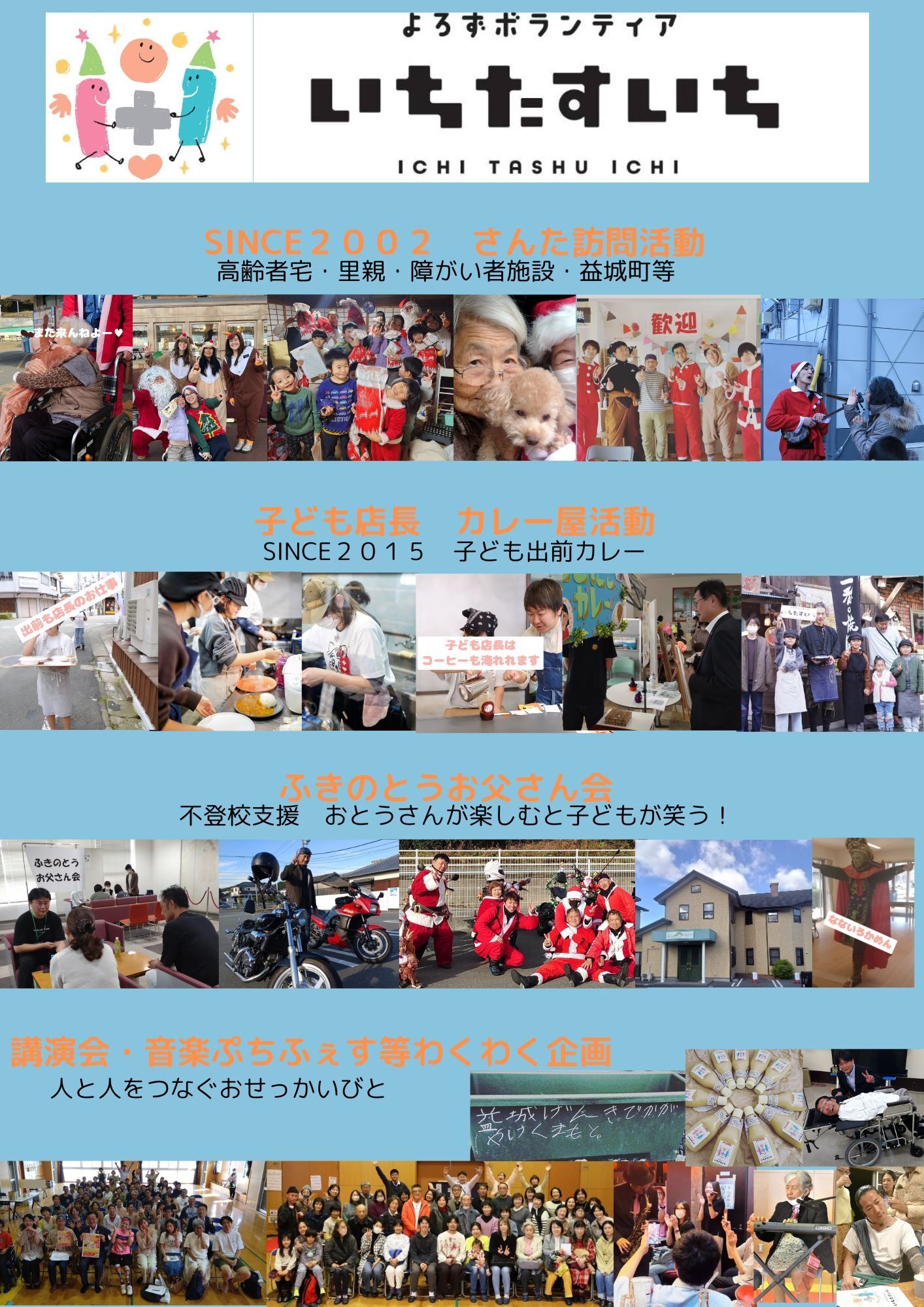 2002年からよろずボランティアいちたすいち(令和4年に現名称に変更)というボランティア団体を運営しております坂田和重と申します。高齢者宅をサンタに扮しての訪問活動から開始。現在は益城町や里親さんや子どもさん宅や障がい者施設、地域のイベント等へ訪問拡大。