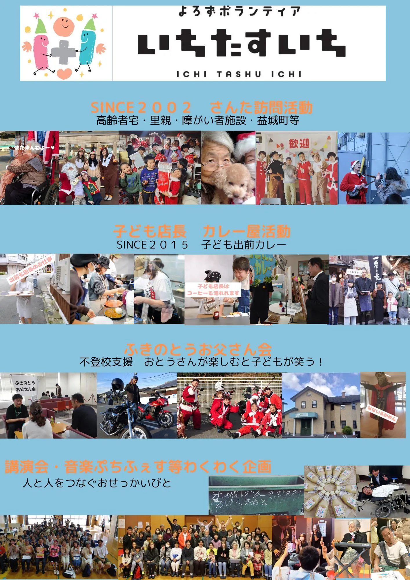 2002年からよろずボランティアいちたすいち(令和4年に現名称に変更)というボランティア団体を運営しております坂田和重と申します。高齢者宅をサンタに扮しての訪問活動から開始。現在は益城町や里親さんや子どもさん宅や障がい者施設、地域のイベント等へ訪問拡大。