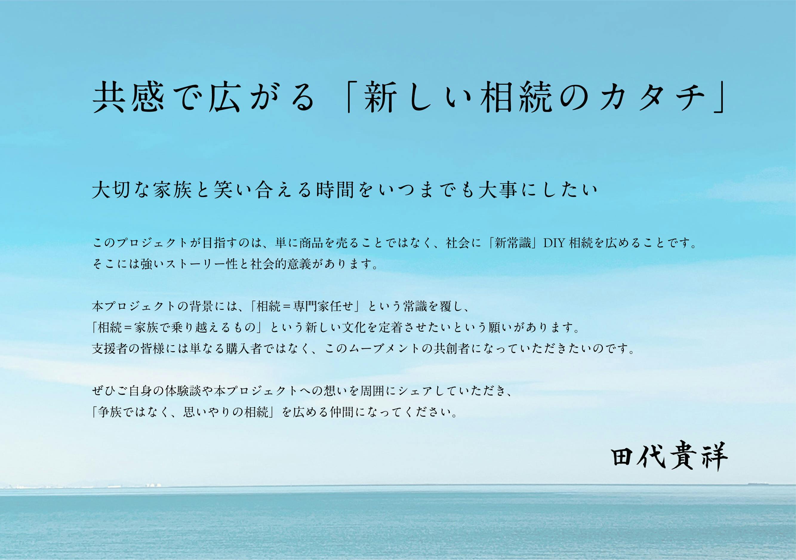 本プロジェクトを通じて、「自分の死後、家族が困らないよう自分で準備する」というDIY相続の文化を日本中に広めたいと考えています。