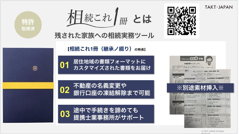 「死」は避けられない。だが、「混乱」は避けられる。人生100年時代、あなたが旅立った後、家族が困らないようにする準備はできていますか?日本では、死や相続の話題はタブー視されがちです。そのため、多くの人が準備を後回しにし、残された家族が複雑な手続きに直面しています。私たちは、『相続これ1冊(継承ノ綴り)』という特許取得済みのDIY相続ファイルを開発しました。これにより、自分たちで相続手続きを大きく解決できる様になりました。