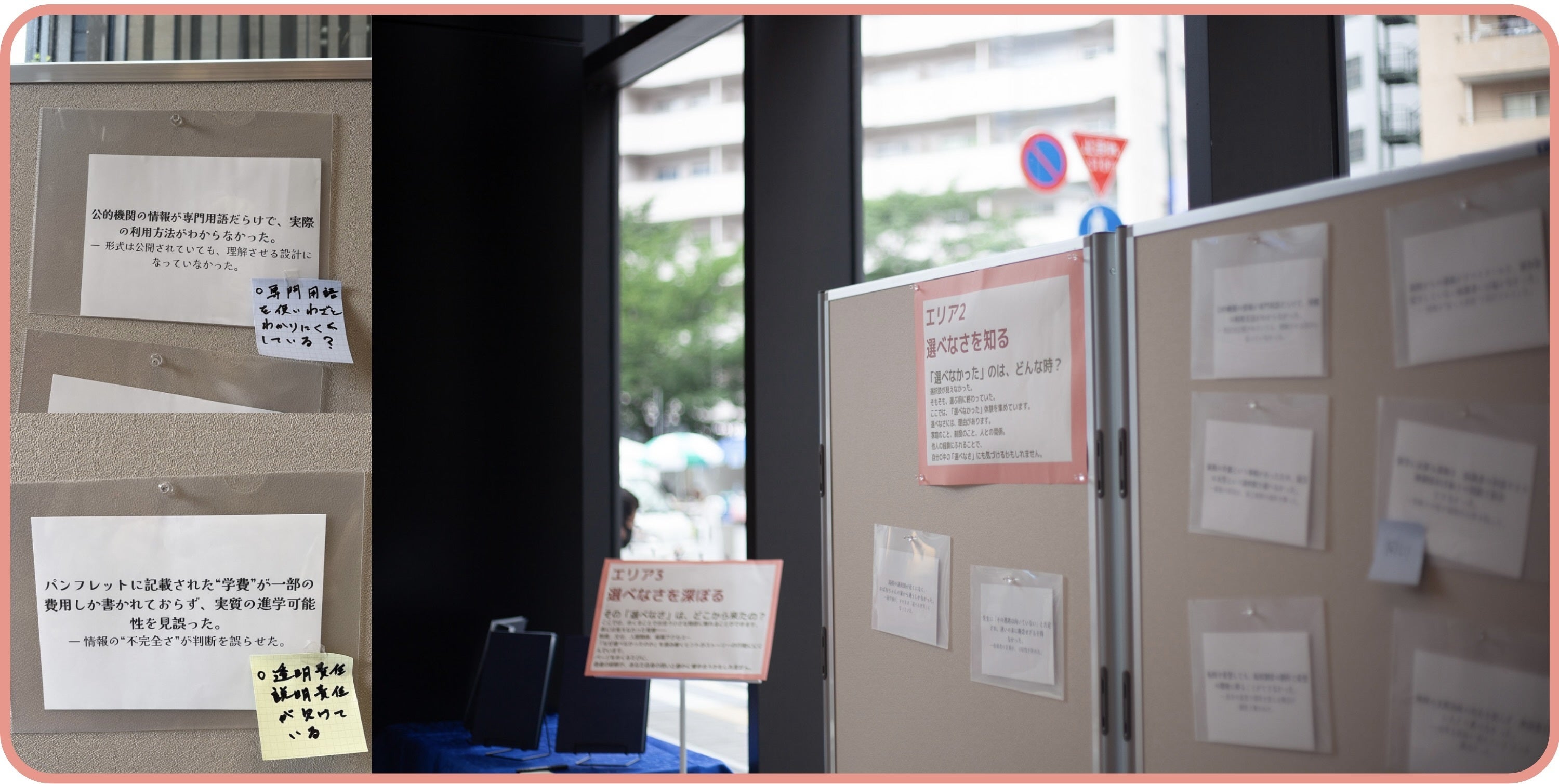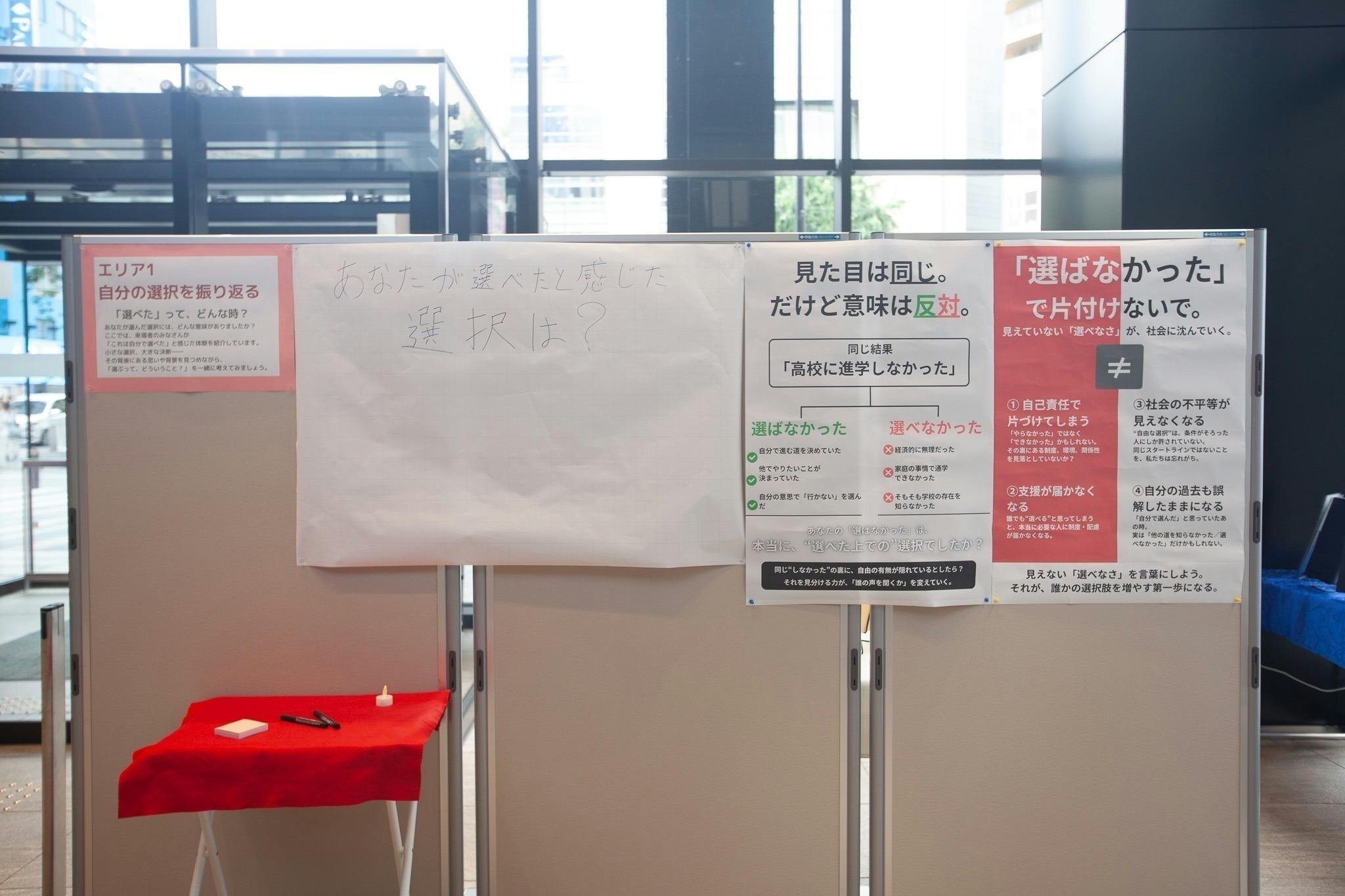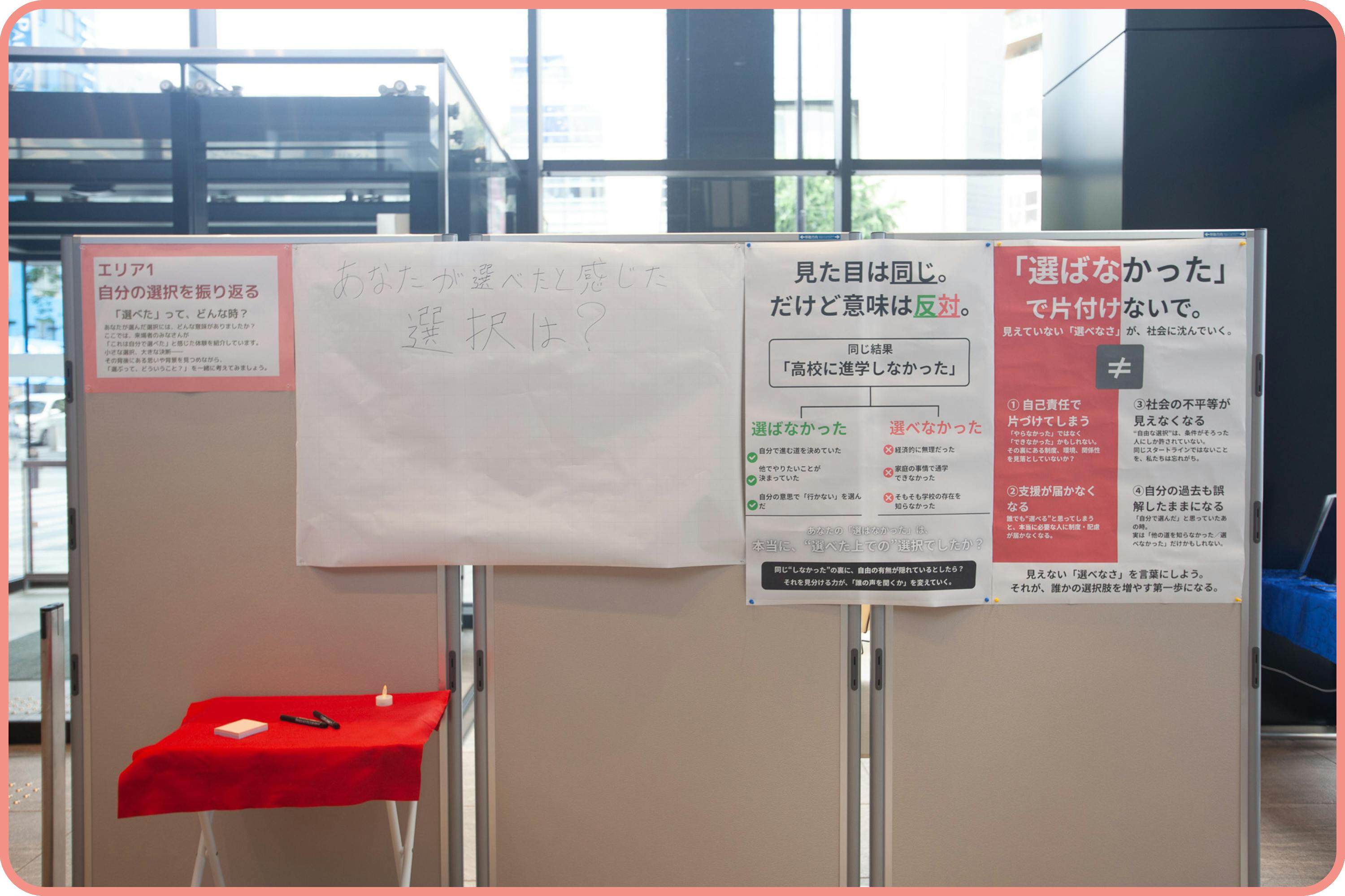 「どんな選択をしてきたか?」「その選択は本当に自由だったか?」問いかけパネルやふせんを通じて、自分自身の“選べた感覚”を静かに問い直す入口。