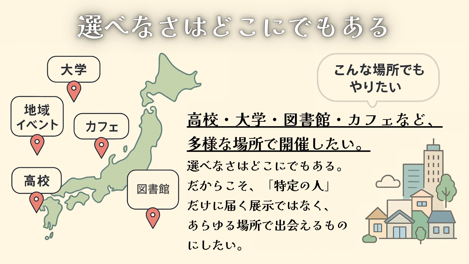 ・教育・福祉・地域など、異なる現場での出張展示やワークショップを企画していきます