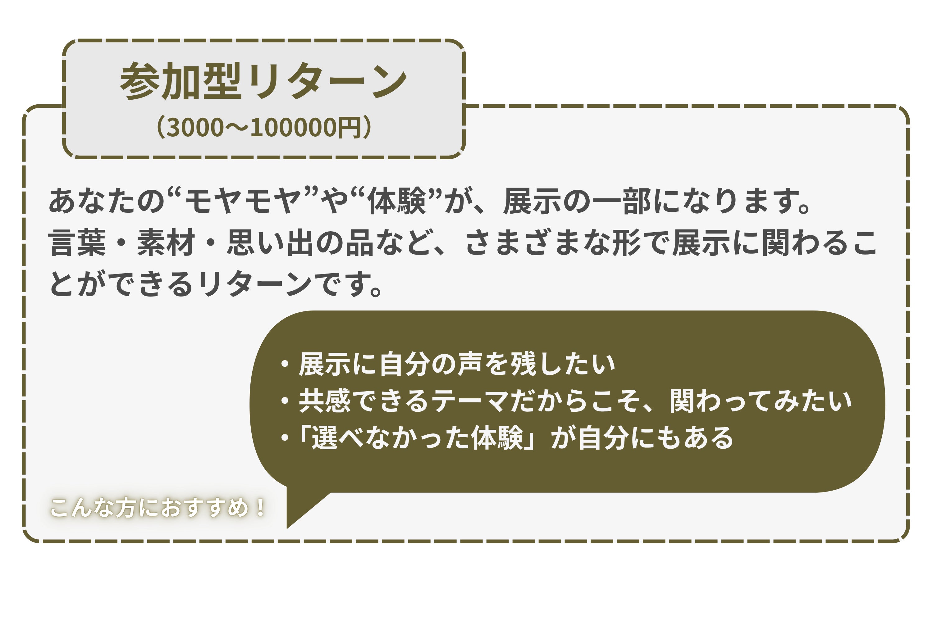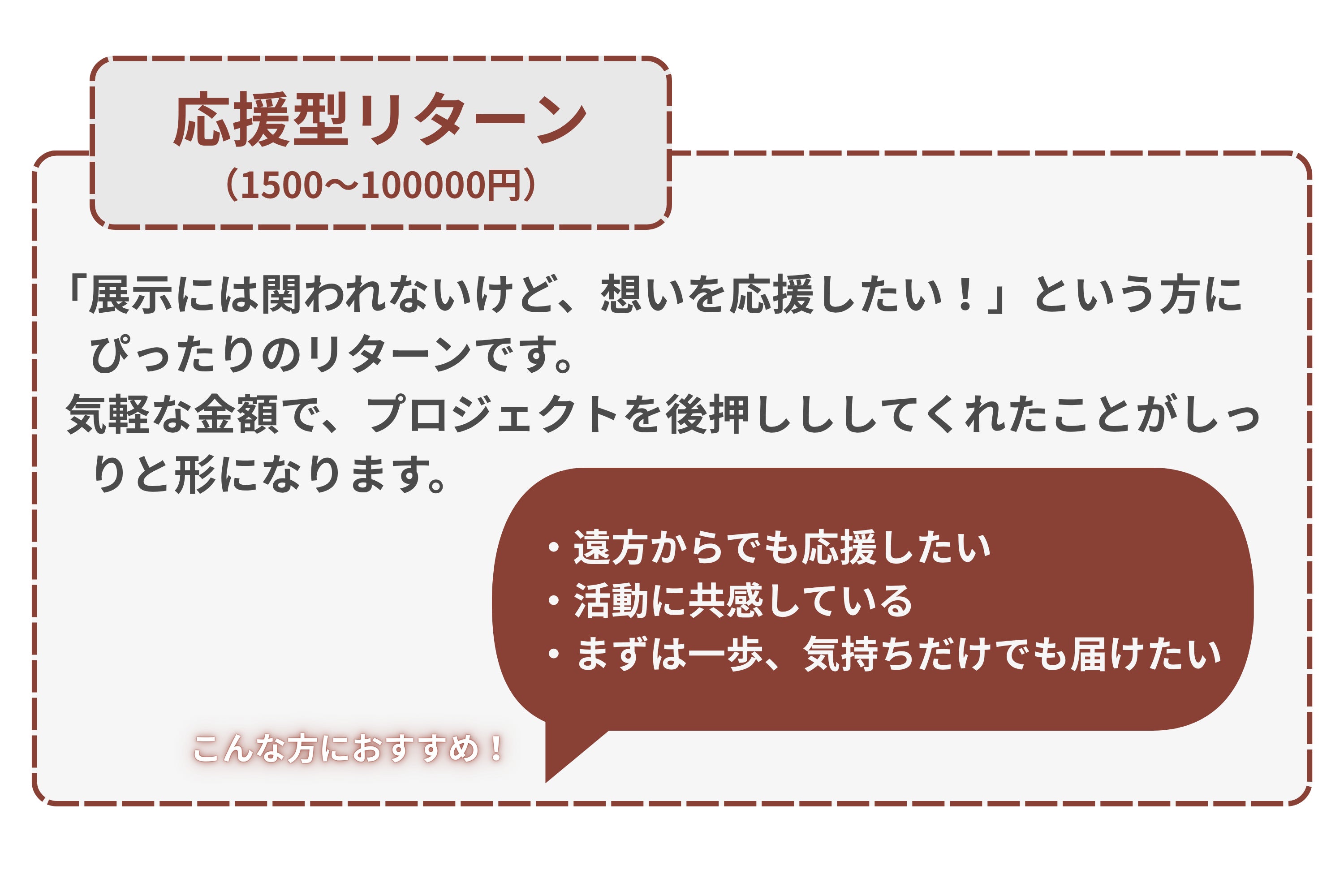 リターンは大きく3つのスタイルに分かれており、応援の気持ちだけでも、展示に関わることも、団体としての協力も歓迎です。