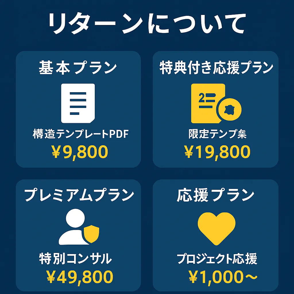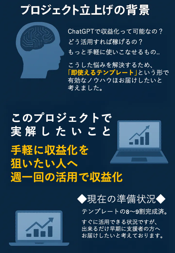 2025/04/22 09:50このたびは本プロジェクトにご関心をお寄せいただき、誠にありがとうございます。現在CAMPFIREのページに表示されている本文やリターン内容は、初期構成である『即金テンプレLAB|ChatGPTで1週間収益化テンプレート』を前提としたままとなっており、実際の進行内容とは異なる状態となっております。■ ページ表示の不具合についてページ本文の編集は可能になっておりますが、変更内容が正しく反映されない不具合が発生しております。また、不要となった旧リターンプランの削除・非表示もできない状態にあるため、現在CAMPFIRE運営に申請・対応依頼中です。そのため、表示内容と実態に差異があり、ご覧いただく皆さまにはご不便をおかけしております。■ プロジェクトの再構築について当初は**『即金テンプレLAB|ChatGPTで1週間収益化テンプレート』**として、「収益構造をテンプレ化して短期間で成果を出す」ことを目的としていました。しかし実際の運用を通じて、単なるテンプレ販売では本質が伝わらない自らの失敗や再挑戦のプロセスこそ共有すべきという反省と気づきがあり、現在はプロジェクト全体を再構築中です。■ 現在のプロジェクト方針(KINARA)『KINARA』は、以下のような構成で進行しています:ChatGPTを活用した“共創型”の収益構造づくり支援者とともに進める「試行錯誤・記録・発信」型のプロジェクト完成された商品ではなく、プロセスそのものを価値とする実験的挑戦■ 最新の進行状況・背景はこちらnote(構想の変遷と背景をまとめています)▶https://note.com/instant_template/n/n83d190c7880aX(旧Twitter)▶ https://x.com/instant_tplプロジェクト名と表示内容の不一致により、混乱を生じさせてしまった皆さまには、心よりお詫び申し上げます。それでもご関心を持ってページをご覧いただいている方々には、深く感謝申し上げます。今後も、誠実に記録と挑戦を積み重ねてまいります。引き続き、どうぞよろしくお願いいたします。 もっと見る