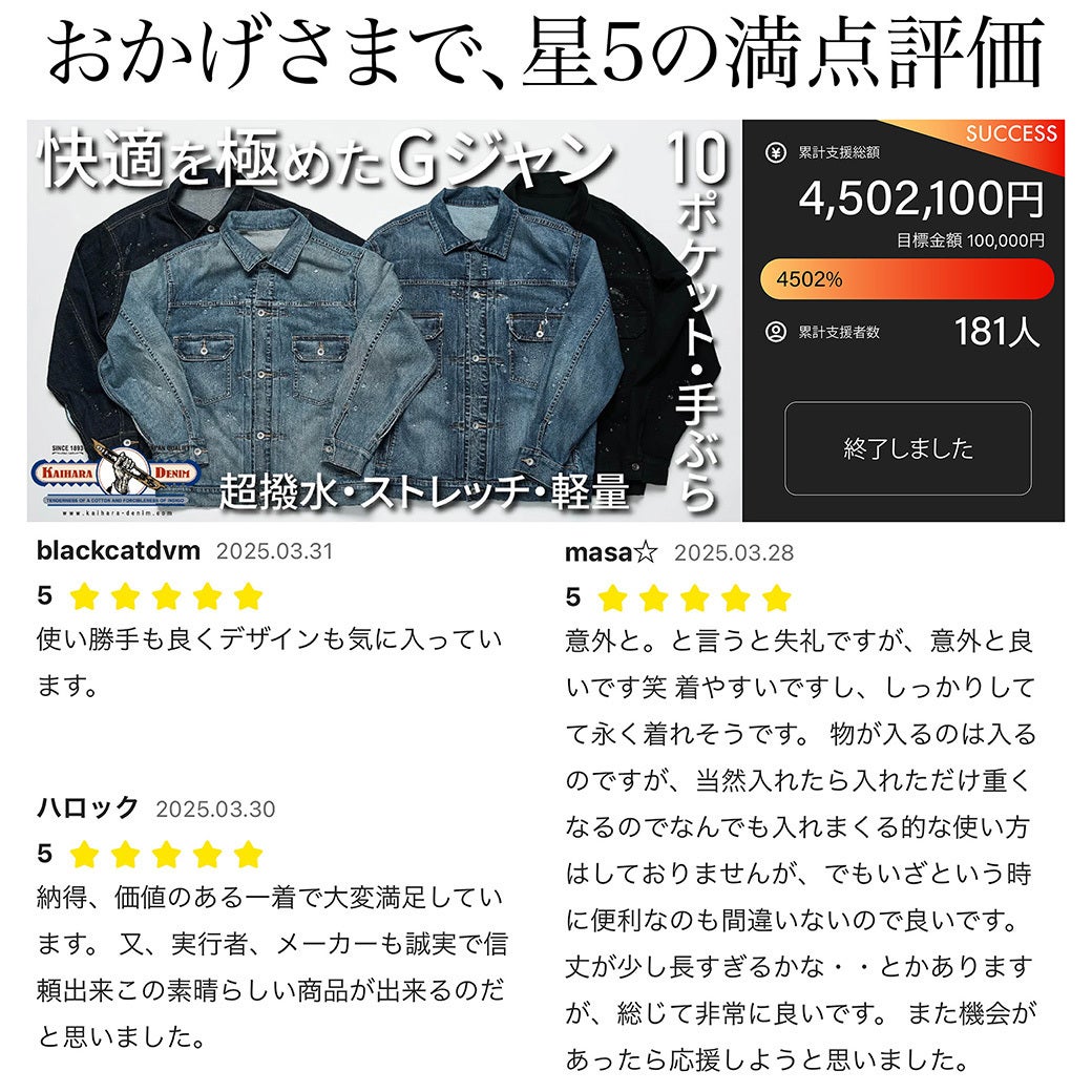 おかげさまで「10 POCKETS JAPAN DENIM JACKET」は、達成率200%を超えることができました!