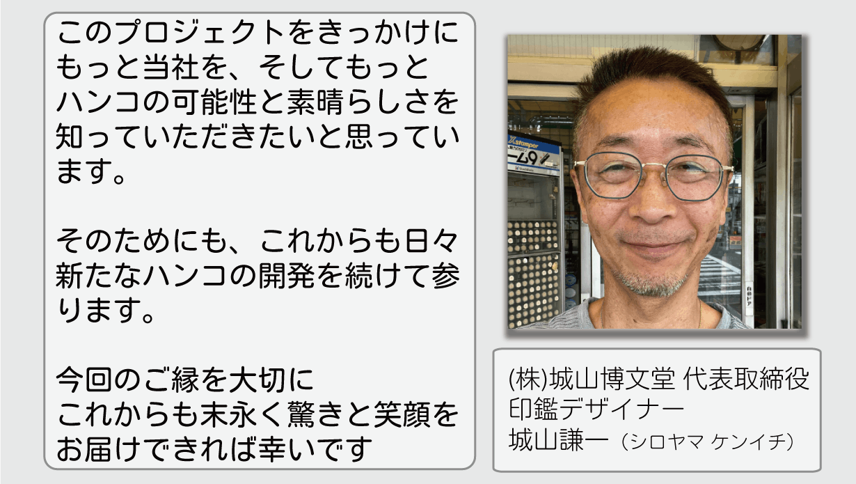 2025/08/27 08:51当プロジェクトのご支援につきましては終了いたしましたご購入いただいた方々、誠にありがとうございます出来るだけ早くハンコをお届けすべく作業してまいりますので、それまで今しばらくお待ちください もっと見る