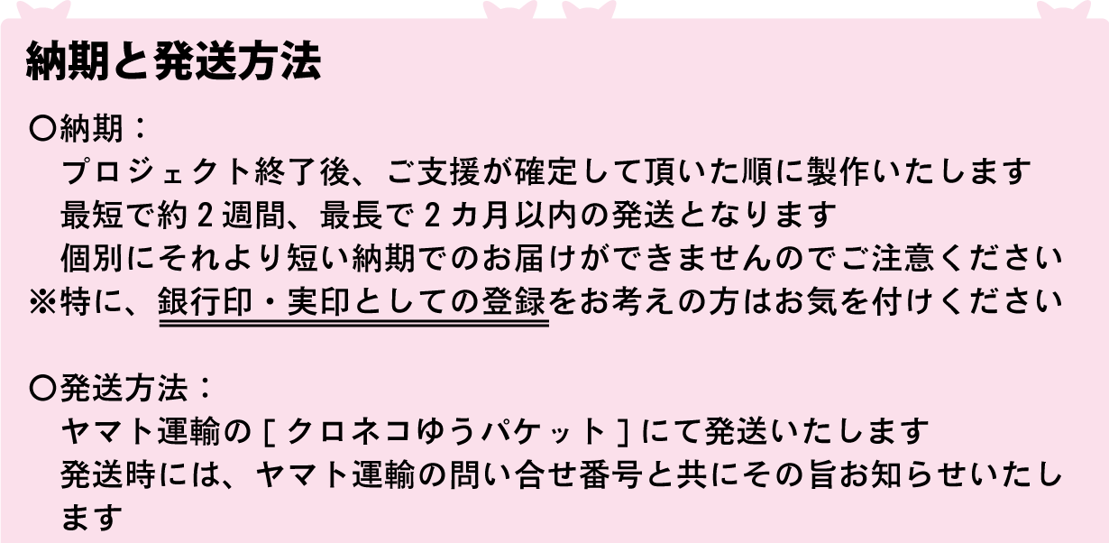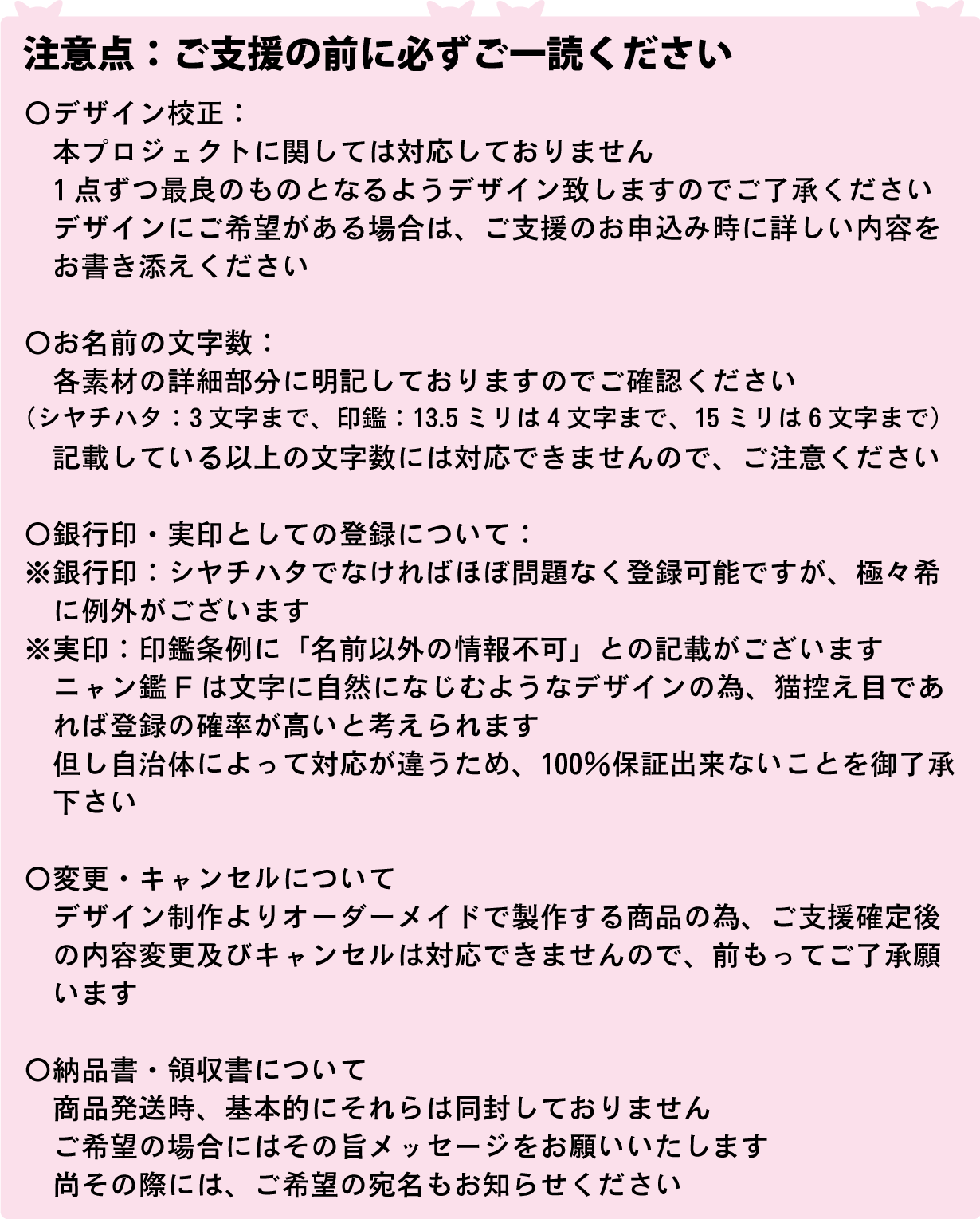 2025/08/05 16:38プロジェクト開始からしばらく経ちました購入をご検討されている方もいらっしゃると思います過去「ニャン鑑」をご購入いただいた方をご紹介いたしますので、購入の参考になれば幸いです-お客様からの声-「ありがとうございました!待ちに待った期待裏切らず思わず笑顔 母の所でも誕生日ハンコ宅急便屋さんに評判良く、品物置いていくのを忘れてしまったそうf^_^;」「一番小さなサイズの印鑑でしたので、ねこちゃんも小さくなってしまいましたが、かえってそれがさりげなくて目立ちすぎないので、仕事用でも使えそう。と家族にも好評でした。永く愛着を持って使えそうで、つくっていただいて本当によかったです。」「お願いしていた「ニャン鑑」が、無事に届きました。袋から出してすぐにペッタンしてみましたが、とても可愛い猫が確かに居ました!何か押印する書類があれば、使ってみるのに・・・とも思いますが、流石にそんな都合よくあるはずもなく、名刺の名前の横にペッタンと押してみたりして、まだ自分だけで楽しんでいます。」「お願いしてよかったなと思っております。思わず空いた紙に押す練習をしてしまいました。(そして家族にみせびらかしました…!)元々新規に銀行口座を作る予定があったので、早速この印鑑で作ってきたいと思います♪頂いたハンコ、大事に使わせて頂きますね。」等々沢山の方からお喜びの感想をいただいております。今回の「ニャン鑑F」でも、たくさんの方に喜びの輪が広がることを期待しております。 もっと見る