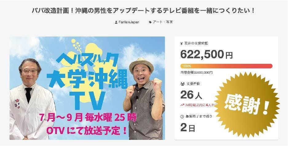 2025/06/28 09:13今回のクラファンが目標額に到達いたしました。ご支援いただいた皆さん、応援いただいた皆さん、関係者の皆さん、本当にありがとうございますm(_ _)mしかし、制作費全体に関してはまだまだ支援が必要な状況なので、6月30日の24時までご支援お待ちしております。・玉城先生の白衣にもっとメッセージをいただきたい(現在4組)・シゲさんに血圧をもっと測らせて欲しいし(現在1組)・橋本さんにもっと歩かせてもらいたいし(現在1組)・キャンさんのアイディア提供を活用してもらいたい(現在2組)そして、僕ももっと腕立てやります^^、(現在4組)ぜひ、6月30日までご支援よろしくお願いいたします。 もっと見る