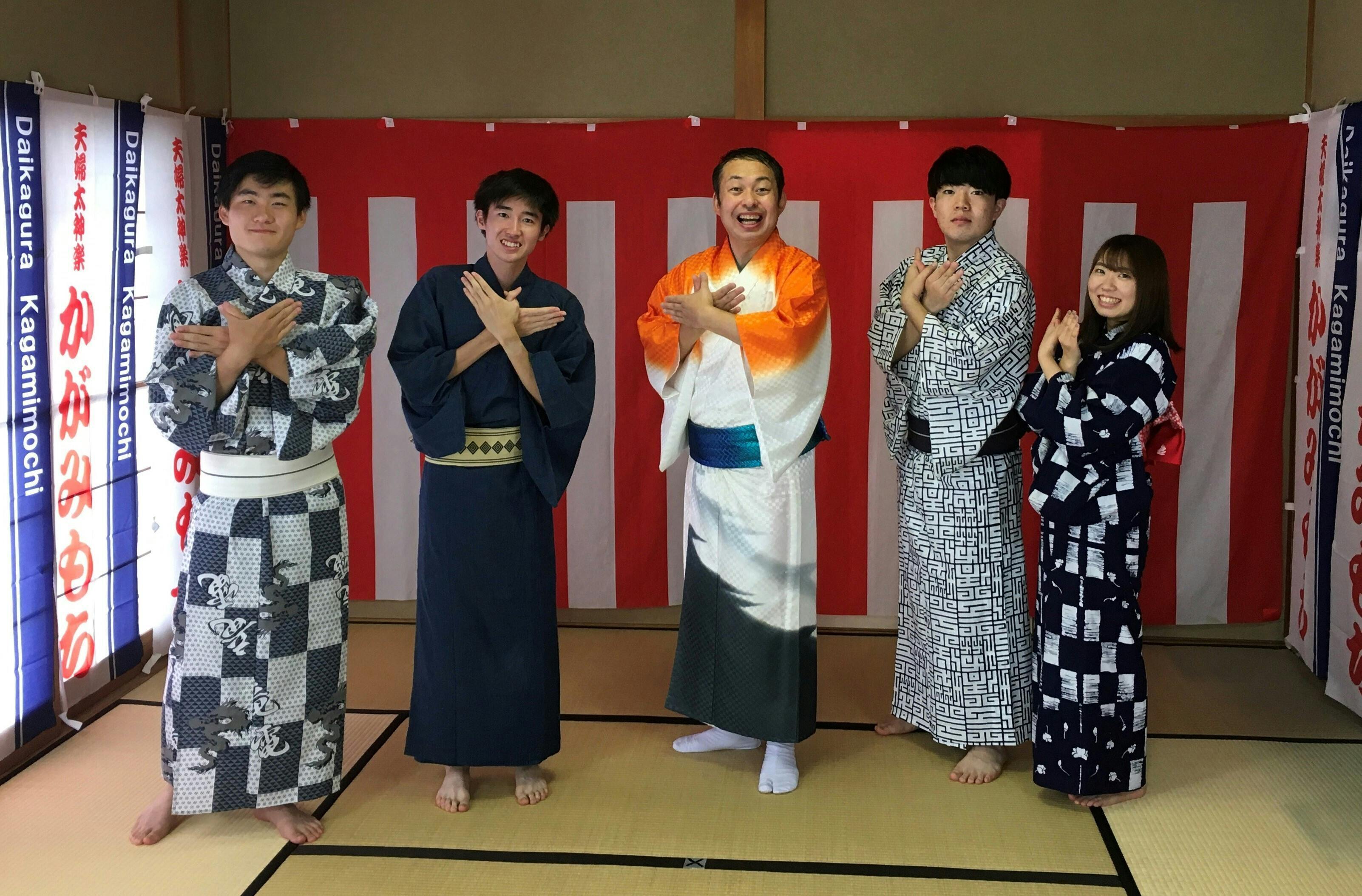 オフィスかがみもち所属の、甲州おもてなし芸人「かがみもち」は、江戸時代から続く伝統芸能の「太神楽(だいかぐら)」を、山梨県を拠点に全国や海外で披露している、丸一仙三(まるいち せんざ)、丸一仙花(まるいち せんか)の夫婦コンビです。傘の上で升を回したり、獅子舞などを披露することを生業としています。